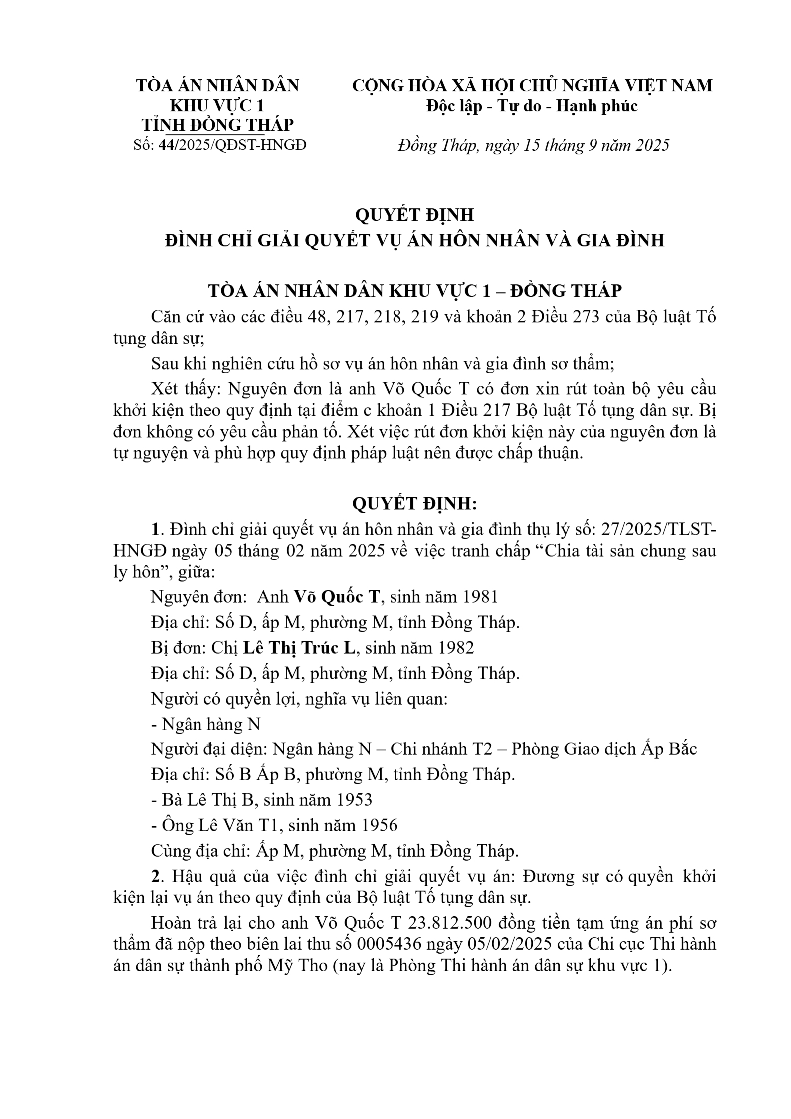 Quyết định số 44/2025/QĐST-HNGĐ ngày 15/09/2025 của Tòa án nhân dân khu vực 1 - Đồng Tháp, tỉnh Đồng Tháp về tranh chấp về chia tài sản khi ly hôn