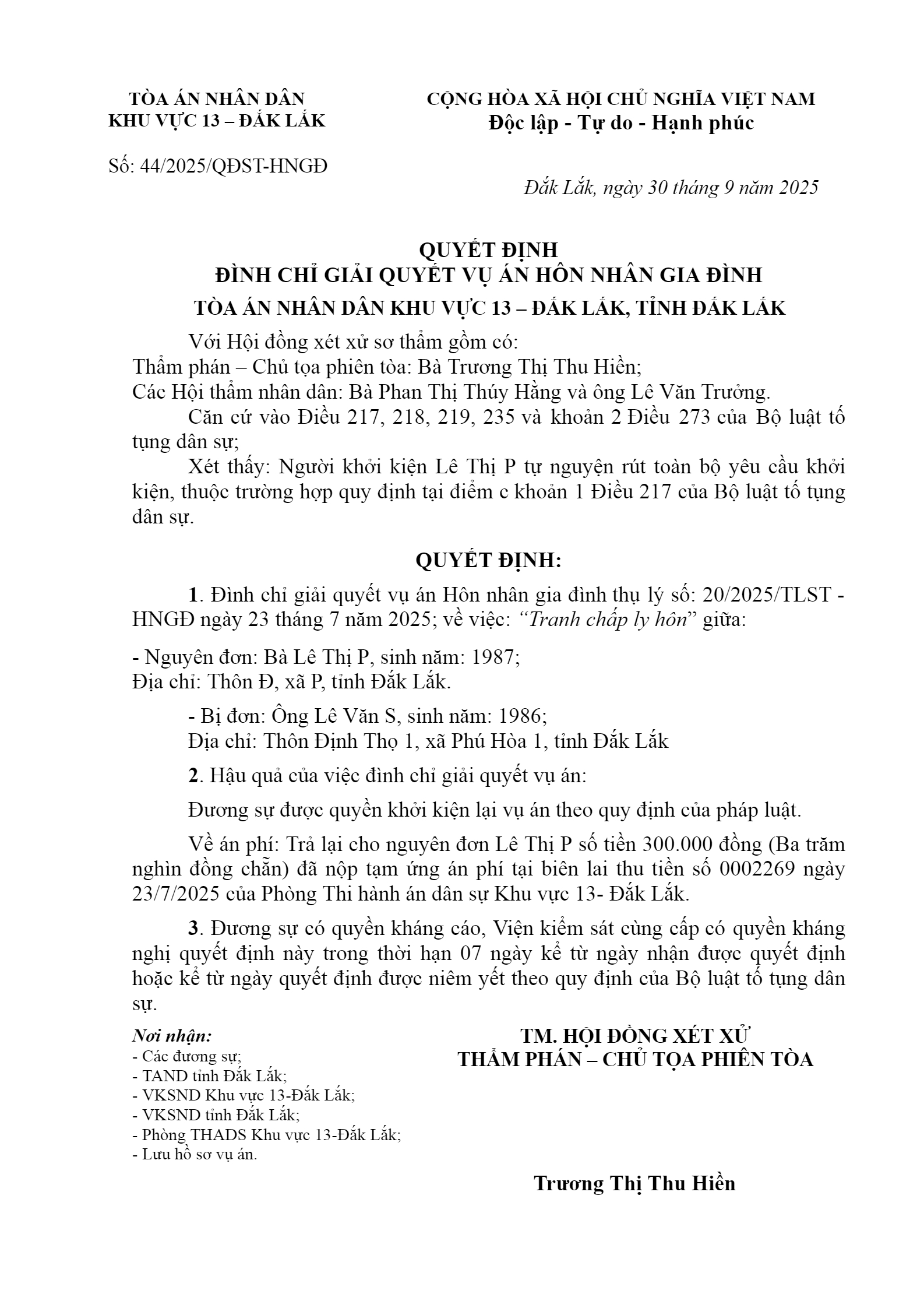 Quyết định số 44/2025/QĐST-HNGĐ ngày 30/09/2025 của Tòa án nhân dân khu vực 13 - Đắk Lắk, tỉnh Đắk Lắk về vụ án ly hôn về mâu thuẫn gia đình