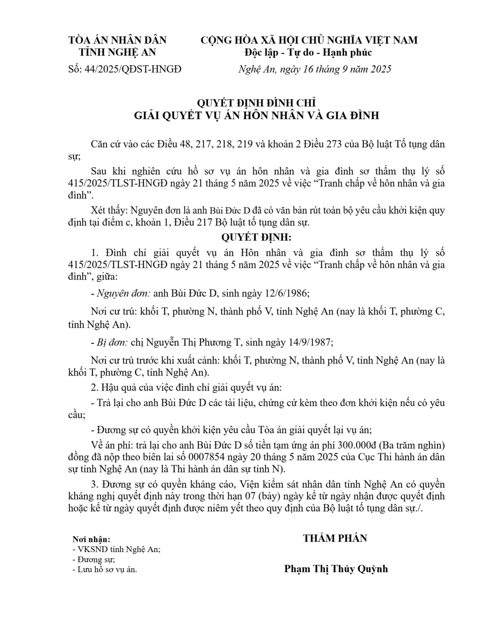 Quyết định số 44/2025/QĐST-HNGĐ ngày 16/09/2025 của TAND tỉnh Nghệ An về vụ án ly hôn do một bên ở nước ngoài