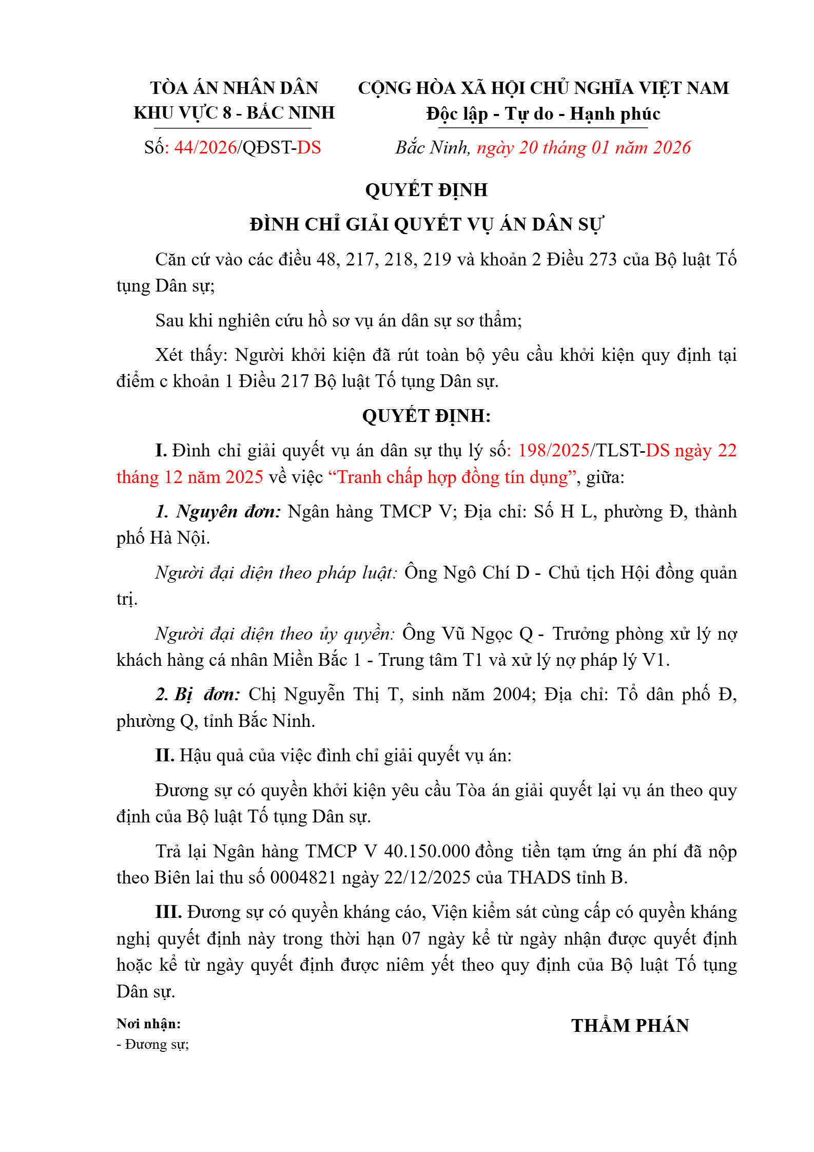 Quyết định số 44/2026/QĐST-DS ngày 20/01/2026 của Tòa án nhân dân khu vực 8 - Bắc Ninh, tỉnh Bắc Ninh về tranh chấp hợp đồng tín dụng