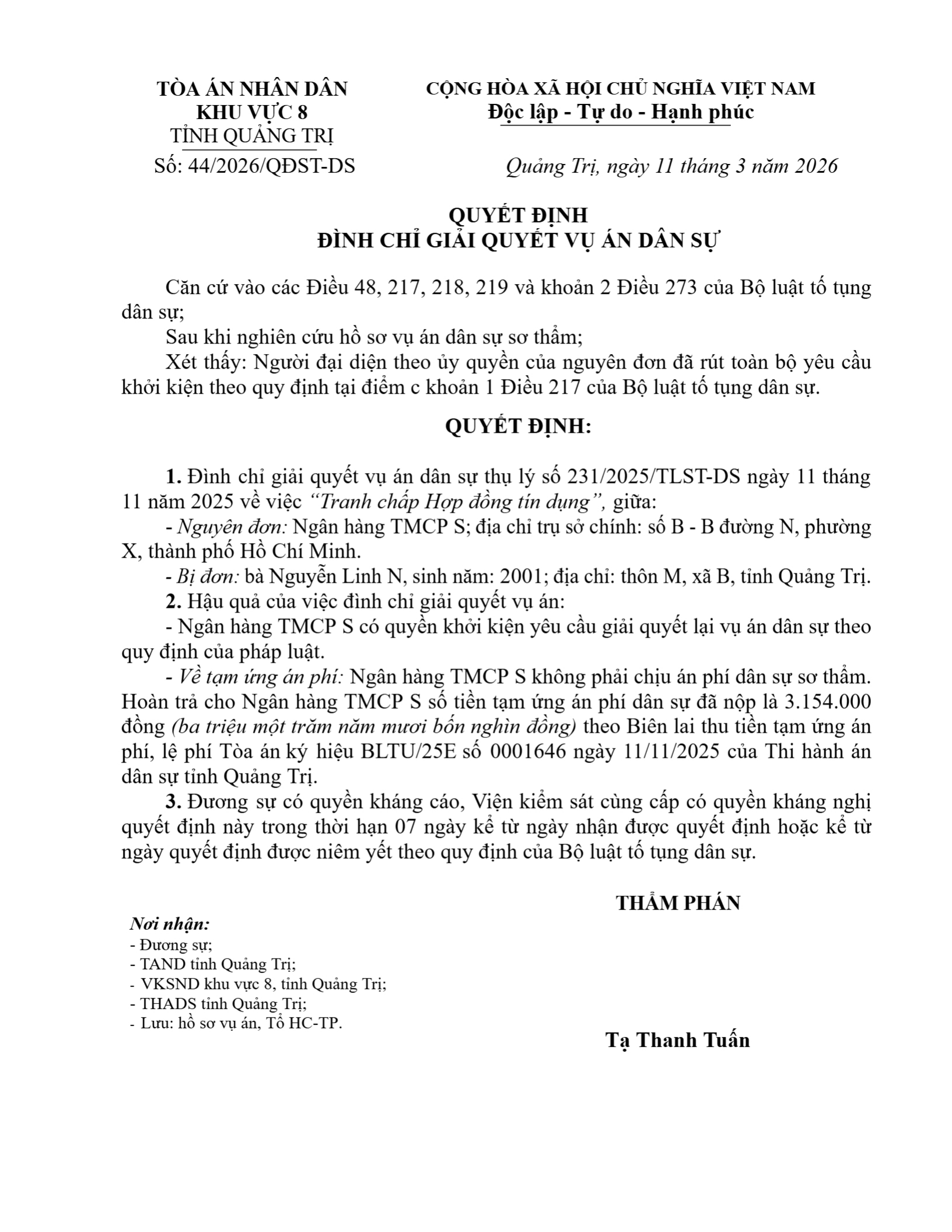 Quyết định số 44/2026/QĐST-DS ngày 11/03/2026 của Tòa án nhân dân khu vực 8 - Quảng Trị, tỉnh Quảng Trị về tranh chấp hợp đồng tín dụng