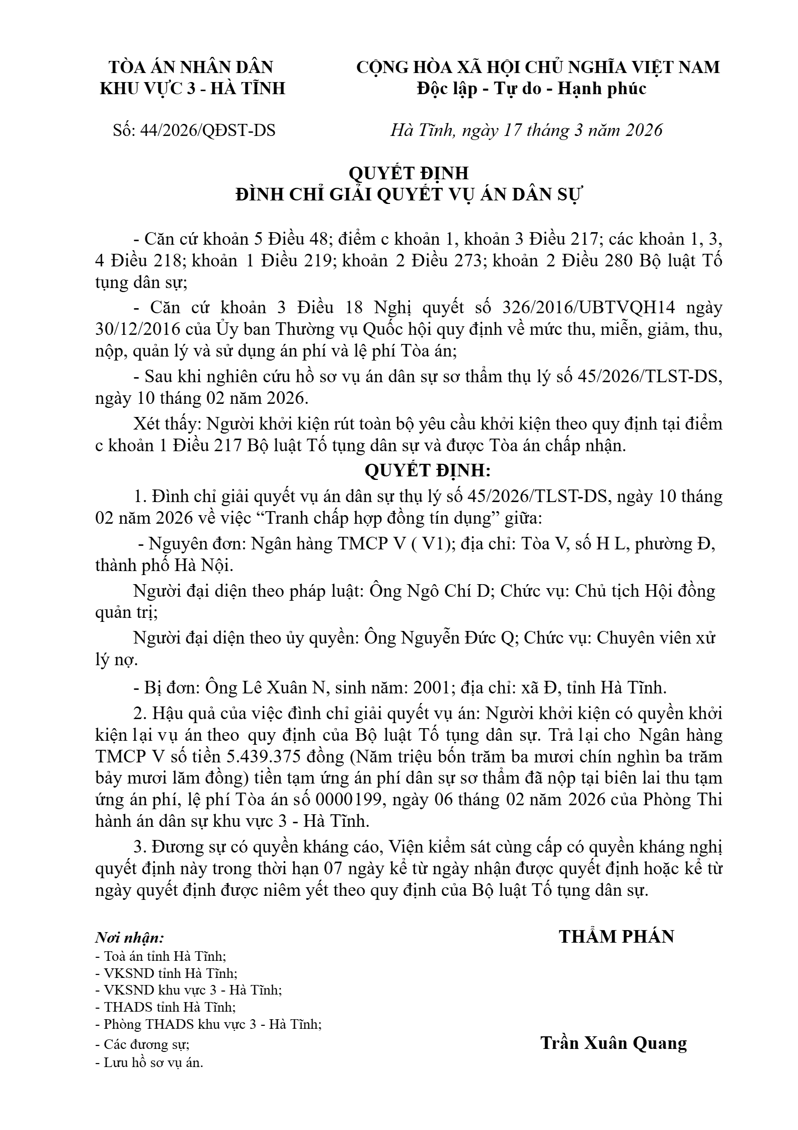 Quyết định số 44/2026/QĐST-DS ngày 17/03/2026 của Tòa án nhân dân khu vực 3 - Hà Tĩnh, tỉnh Hà Tĩnh về tranh chấp hợp đồng tín dụng
