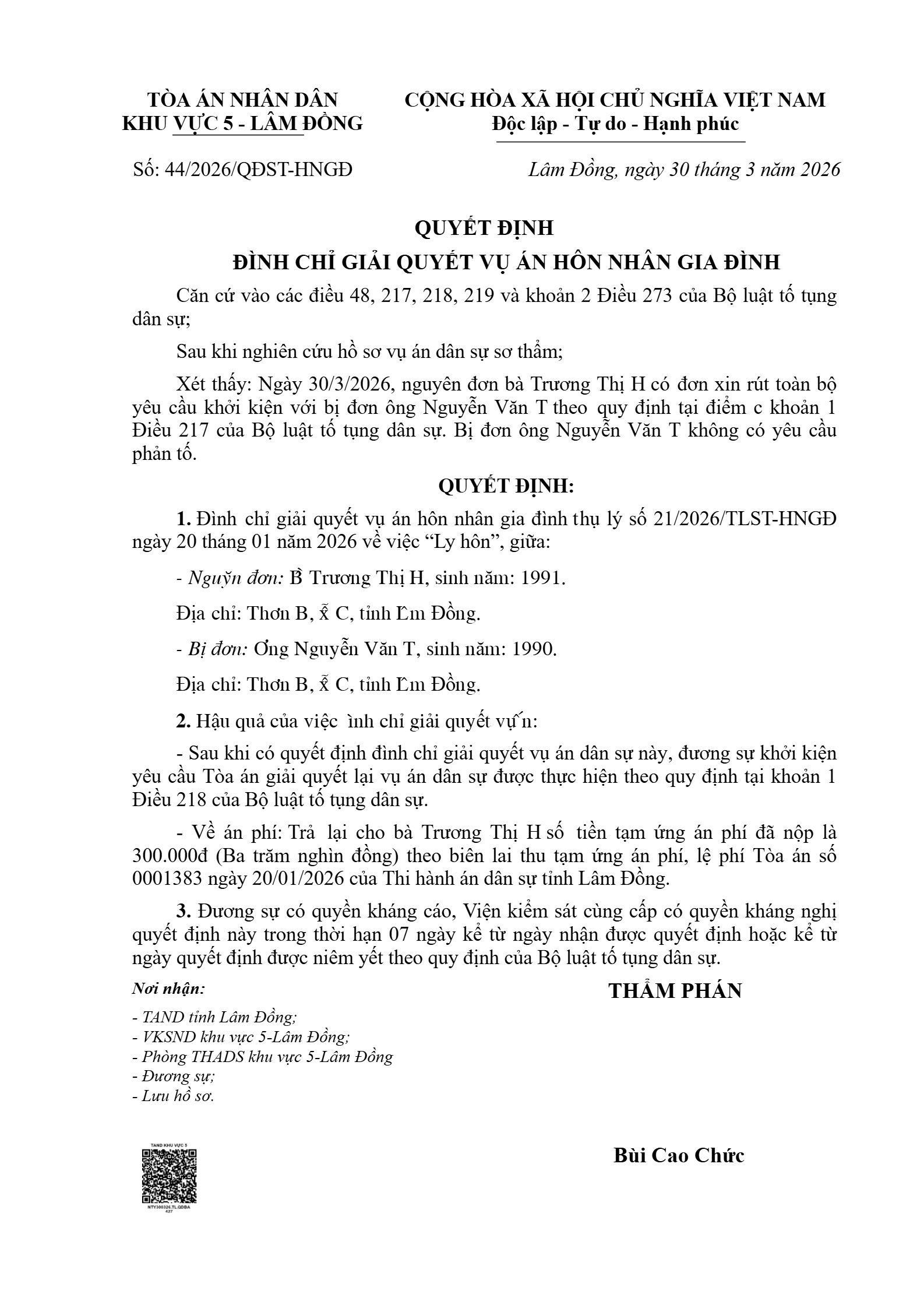 Quyết định số 44/2026/QĐST-HNGĐ ngày 30/03/2026 của Tòa án nhân dân khu vực 5 - Lâm Đồng, tỉnh Lâm Đồng về vụ án ly hôn về mâu thuẫn gia đình