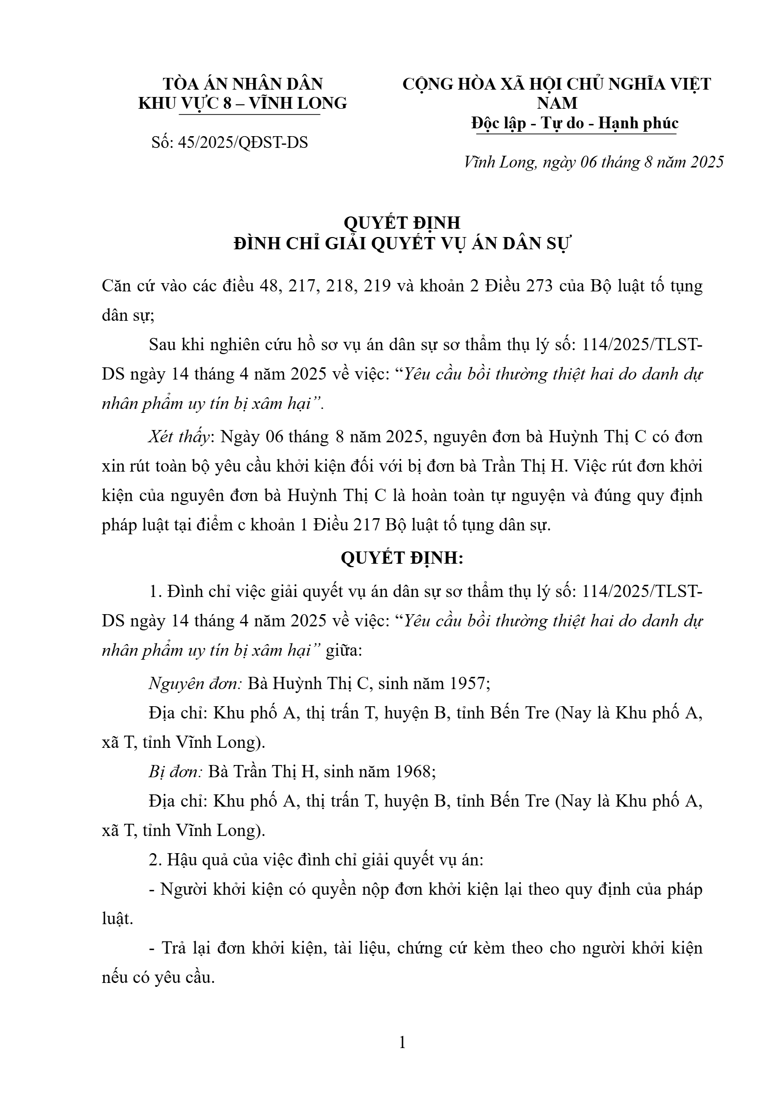 Quyết định số 45/2025/QĐST-DS ngày 06/08/2025 của Tòa án nhân dân khu vực 8 - Vĩnh Long, tỉnh Vĩnh Long về đòi bồi thường thiệt hại ngoài hợp đồng về danh dự, nhân phẩm, uy tín