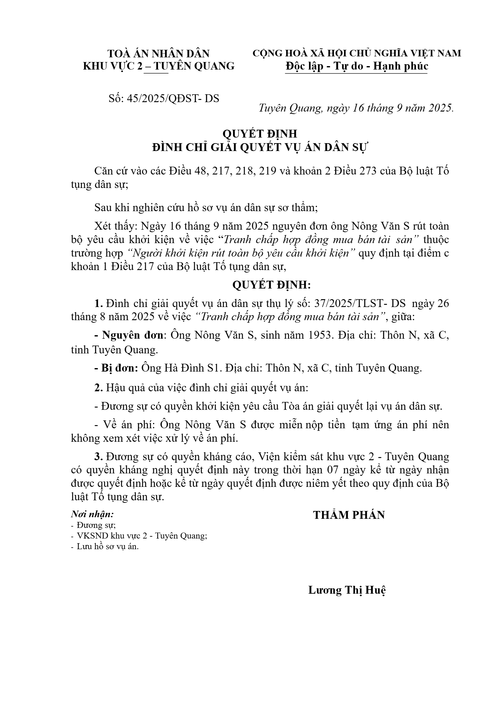 | Thông tin về vụ/việc: | QĐ ĐCVA số 45 Nông Văn S - Hà Đình S1 |