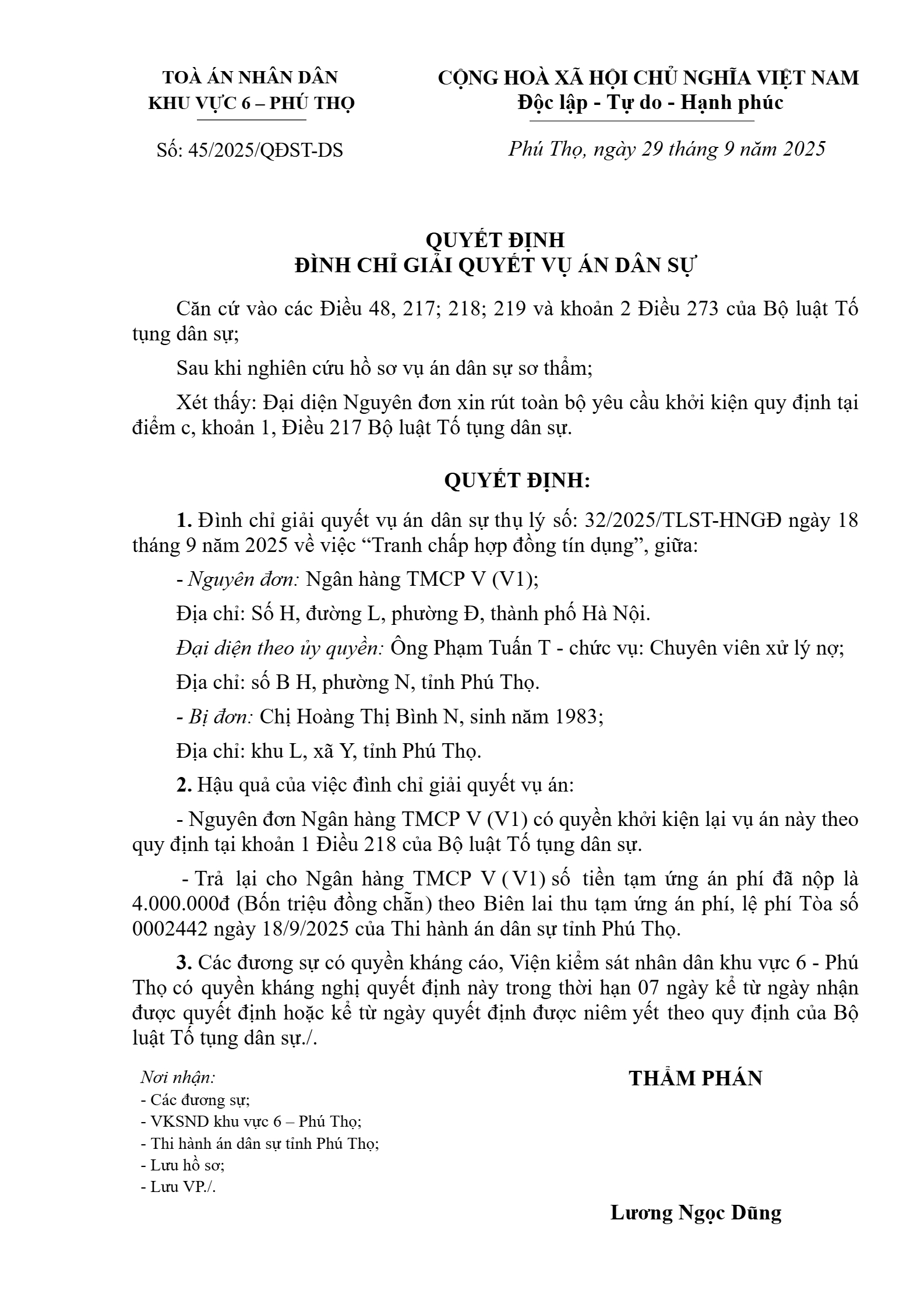 Quyết định số 45/2025/QĐST-DS ngày 29/09/2025 của Tòa án nhân dân khu vực 6 - Phú Thọ, tỉnh Phú Thọ về tranh chấp hợp đồng tín dụng