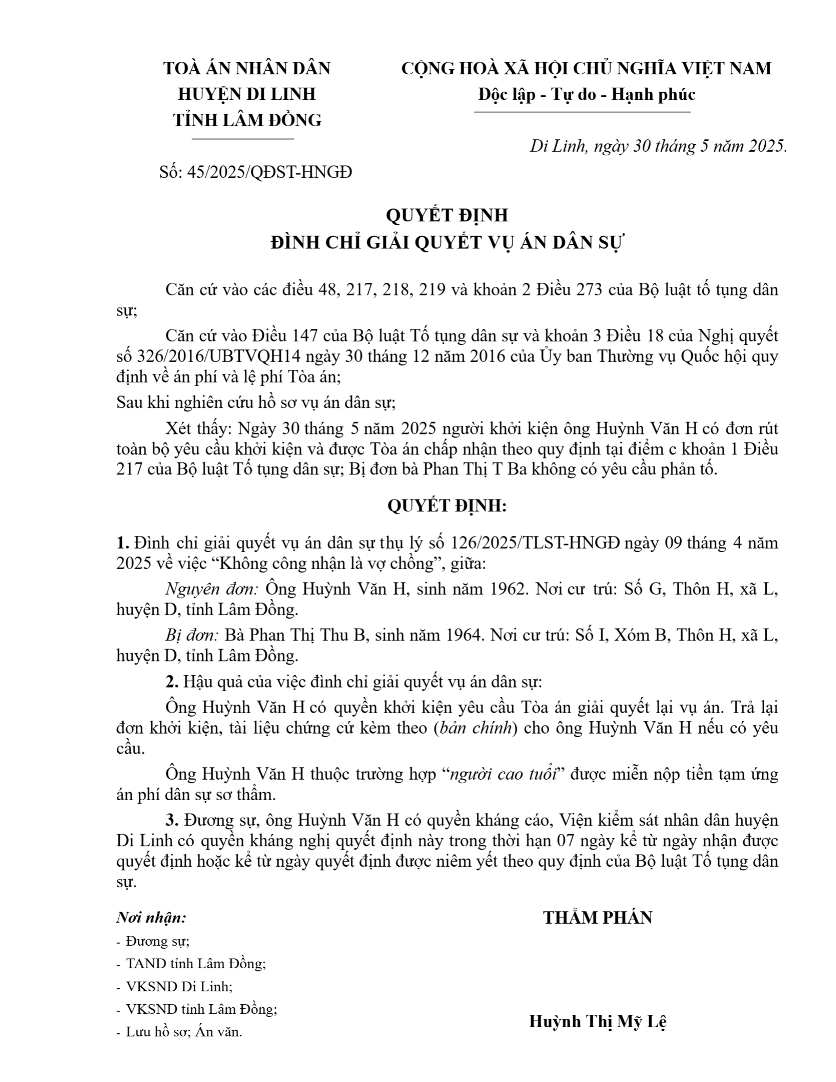 | Tên Quyết định: | Quyết định số 45/2025/QĐST-HNGĐ ngày 30/05/2025 của TAND huyện Di Linh, tỉnh Lâm Đồng về vụ án ly hôn về mâu thuẫn gia đình |