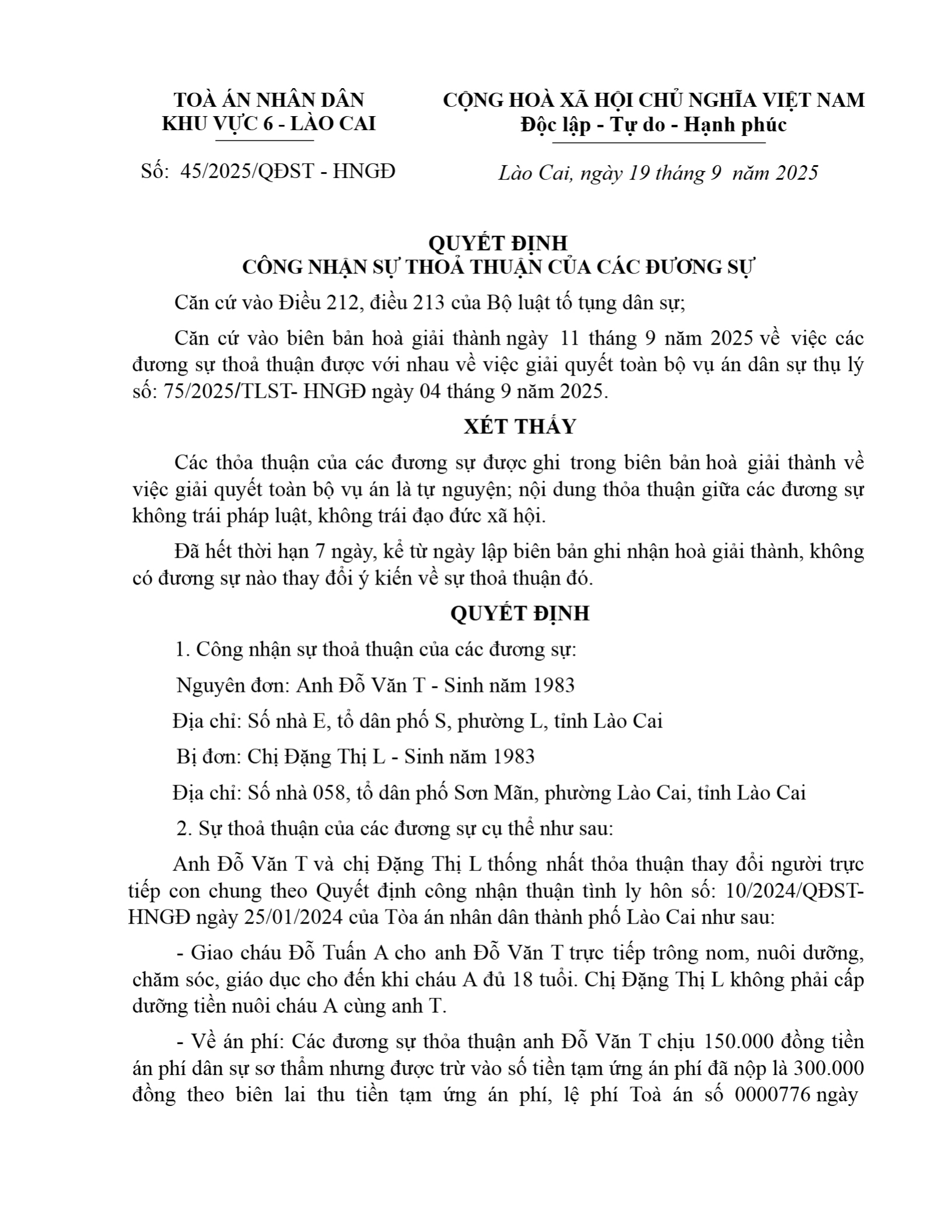 Quyết định số 45/2025/QĐST-HNGĐ ngày 19/09/2025 của Tòa án nhân dân khu vực 6 - Lào Cai, tỉnh Lào Cai về tranh chấp về thay đổi người trực tiếp nuôi con sau khi ly hôn