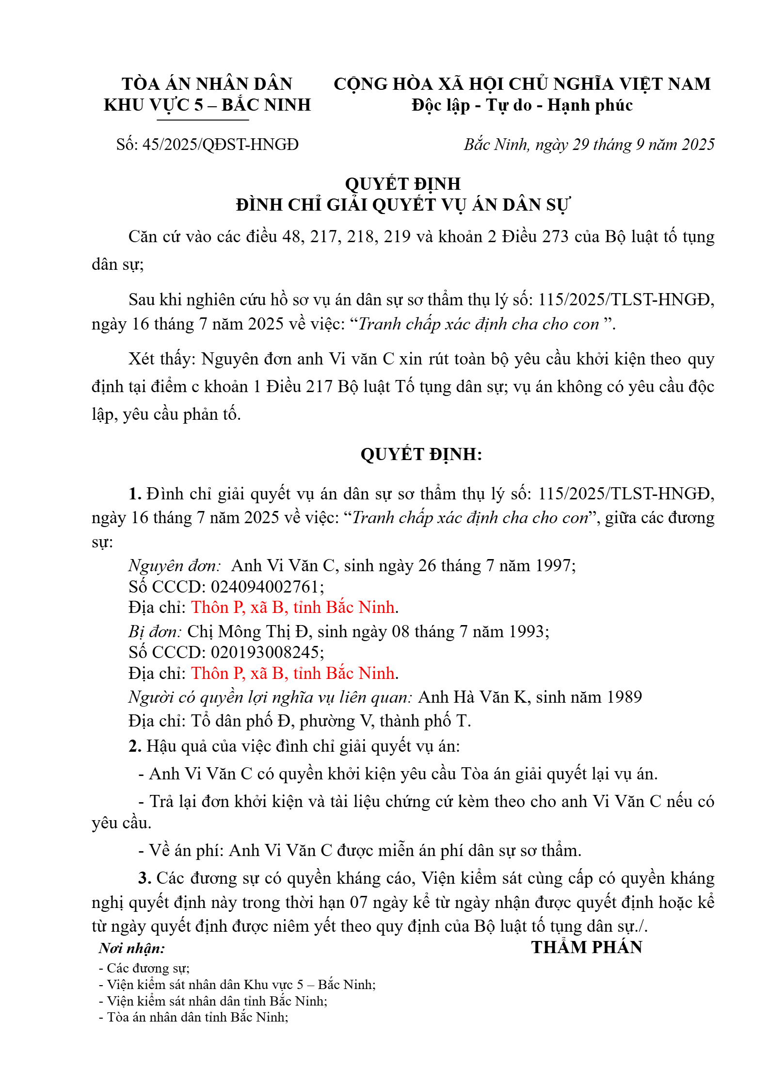 Quyết định số 45/2025/QĐST-HNGĐ ngày 29/09/2025 của Tòa án nhân dân khu vực 5 - Bắc Ninh, tỉnh Bắc Ninh về vụ án ly hôn về mâu thuẫn gia đình
