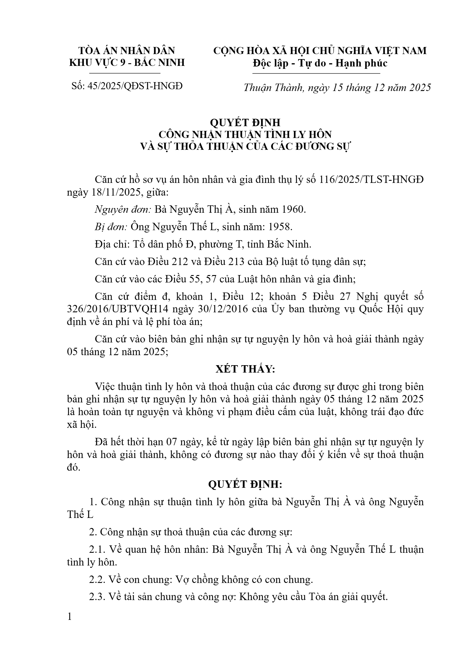 Quyết định số 45/2025/QĐST-HNGĐ ngày 15/12/2025 của Tòa án nhân dân khu vực 9 - Bắc Ninh, tỉnh Bắc Ninh về vụ án ly hôn về mâu thuẫn gia đình