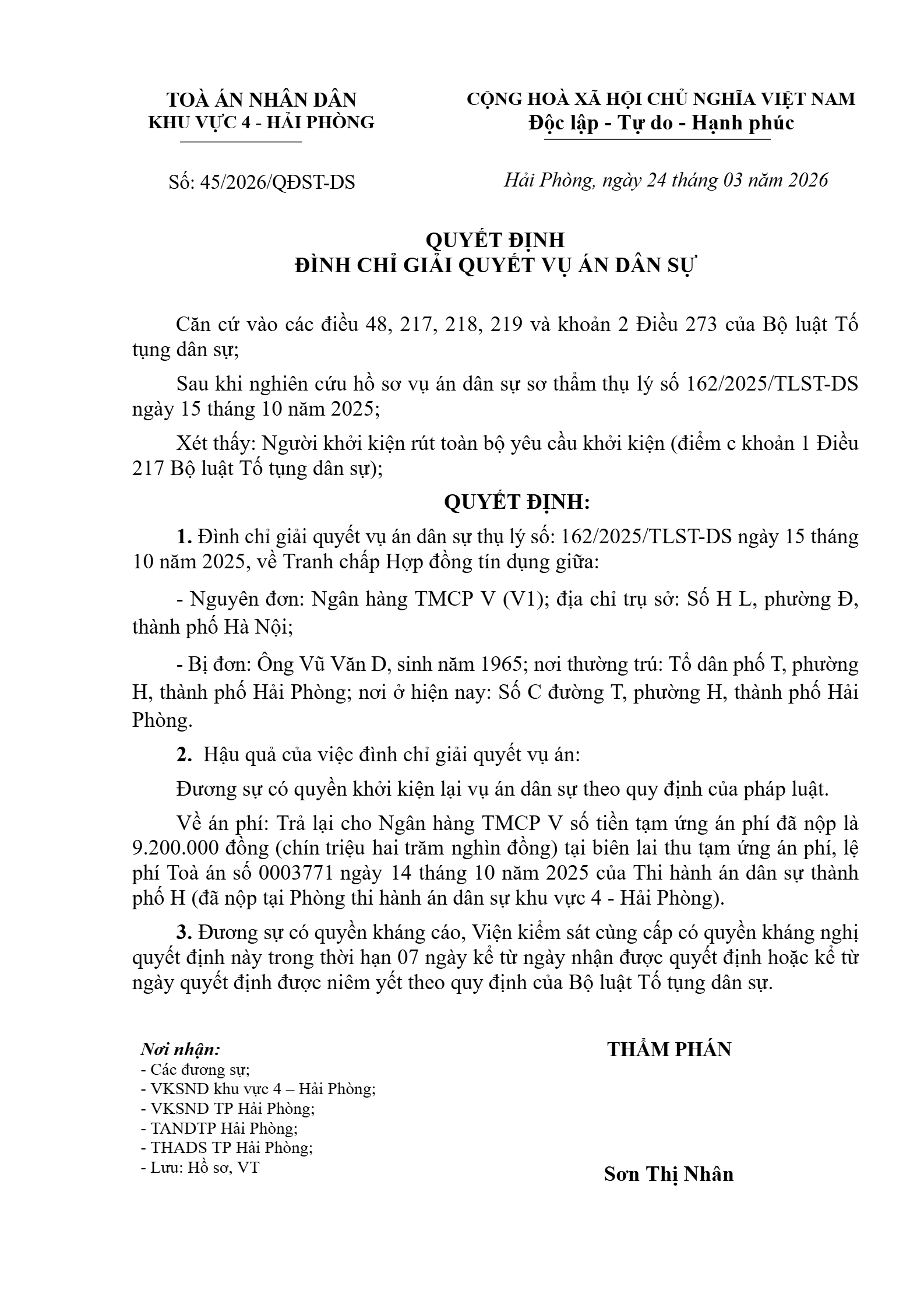 Quyết định số 45/2026/QĐST-DS ngày 24/03/2026 của Tòa án nhân dân khu vực 4 - Hải Phòng, TP. Hải Phòng về tranh chấp hợp đồng tín dụng