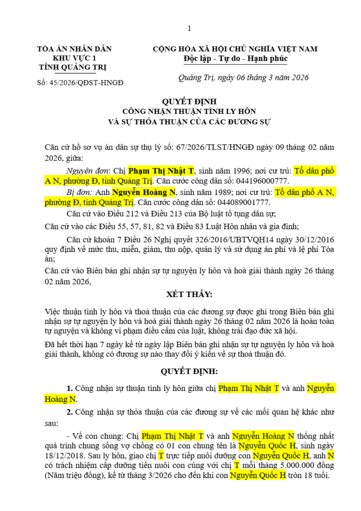 Quyết định số 45/2026/QĐST-HNGĐ ngày 06/03/2026 của Tòa án nhân dân khu vực 1 - Quảng Trị, tỉnh Quảng Trị về vụ án ly hôn về mâu thuẫn gia đình