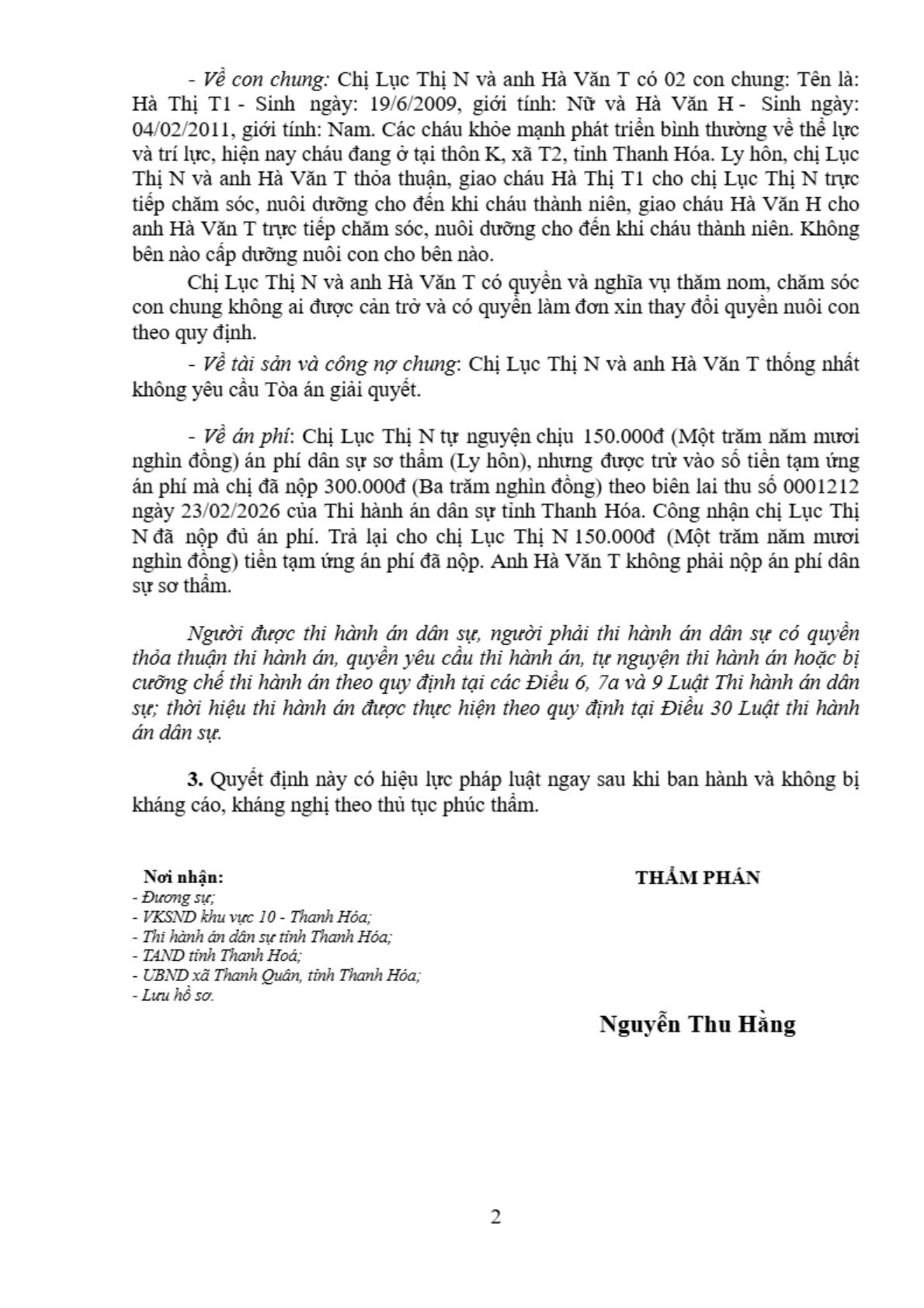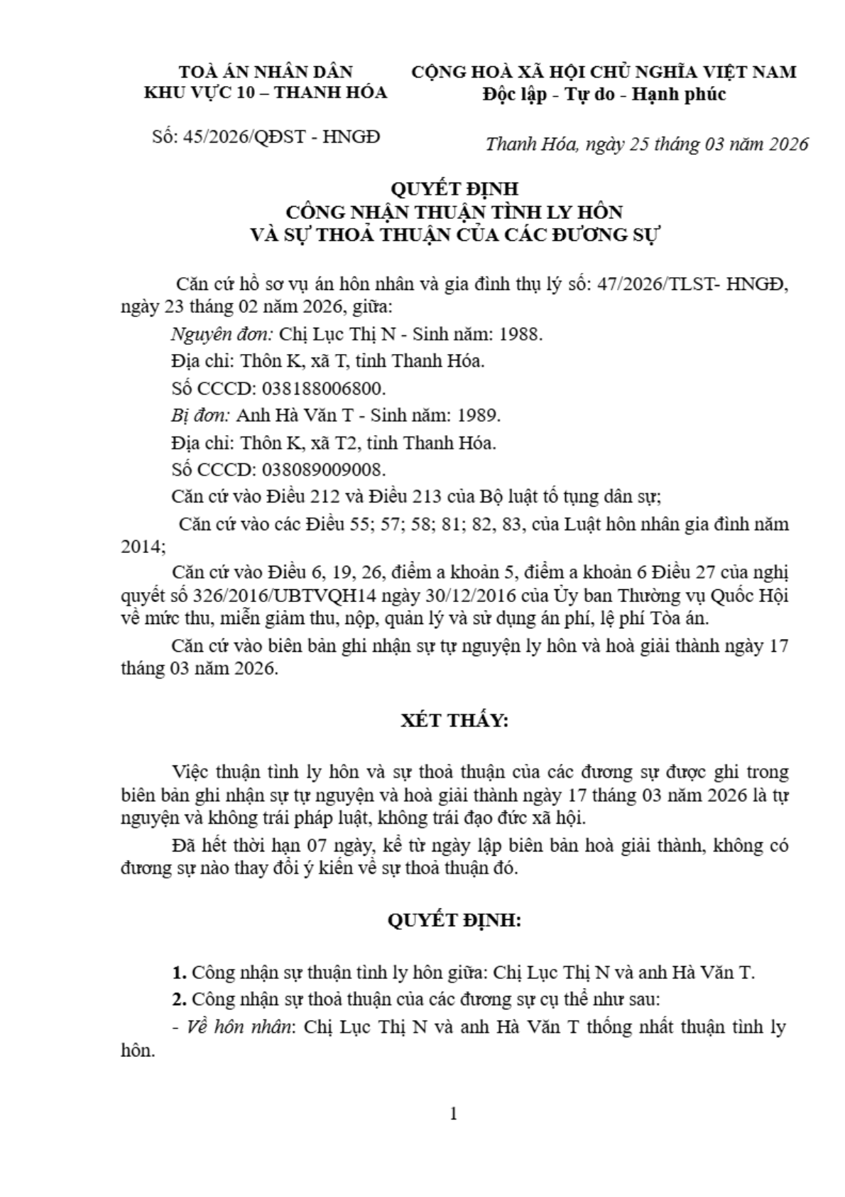 Quyết định số 45/2026/QĐST-HNGĐ ngày 25/03/2026 của Tòa án nhân dân khu vực 10 - Thanh Hóa, tỉnh Thanh Hóa về vụ án ly hôn về mâu thuẫn gia đình