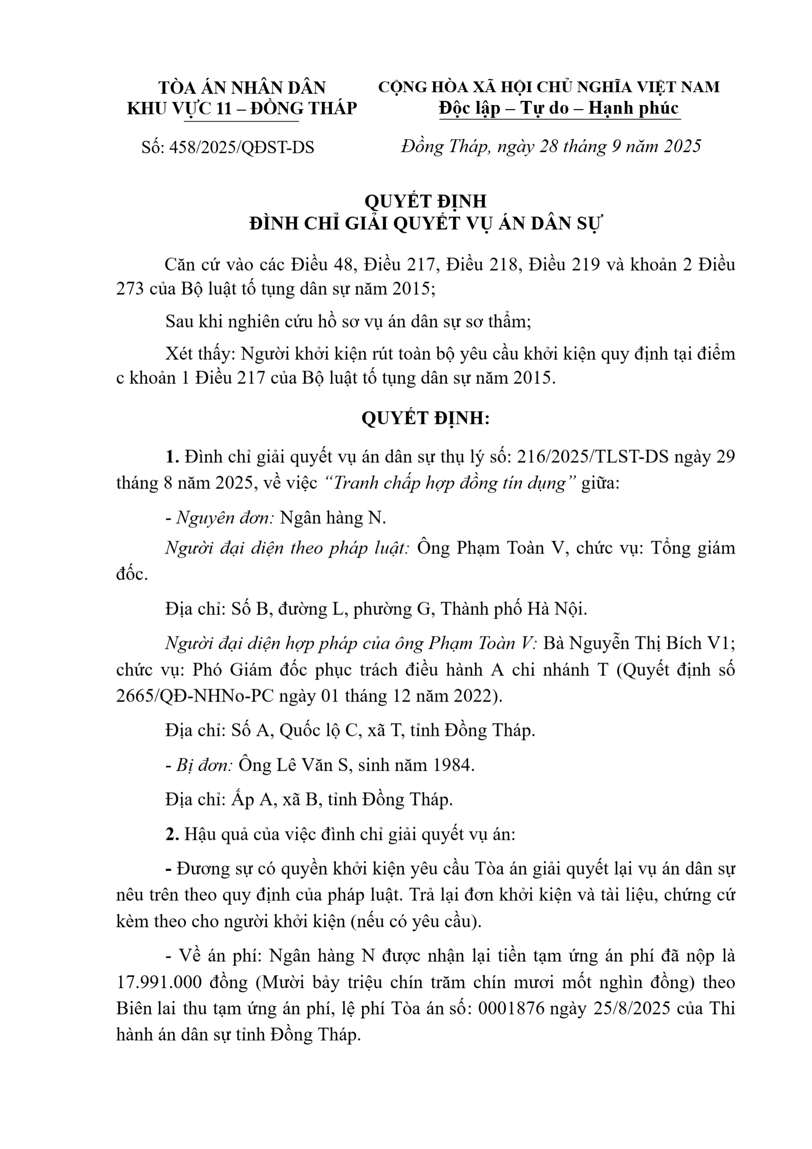 Quyết định số 458/2025/QĐST-DS ngày 28/09/2025 của Tòa án nhân dân khu vực 11 - Đồng Tháp, tỉnh Đồng Tháp về tranh chấp hợp đồng tín dụng