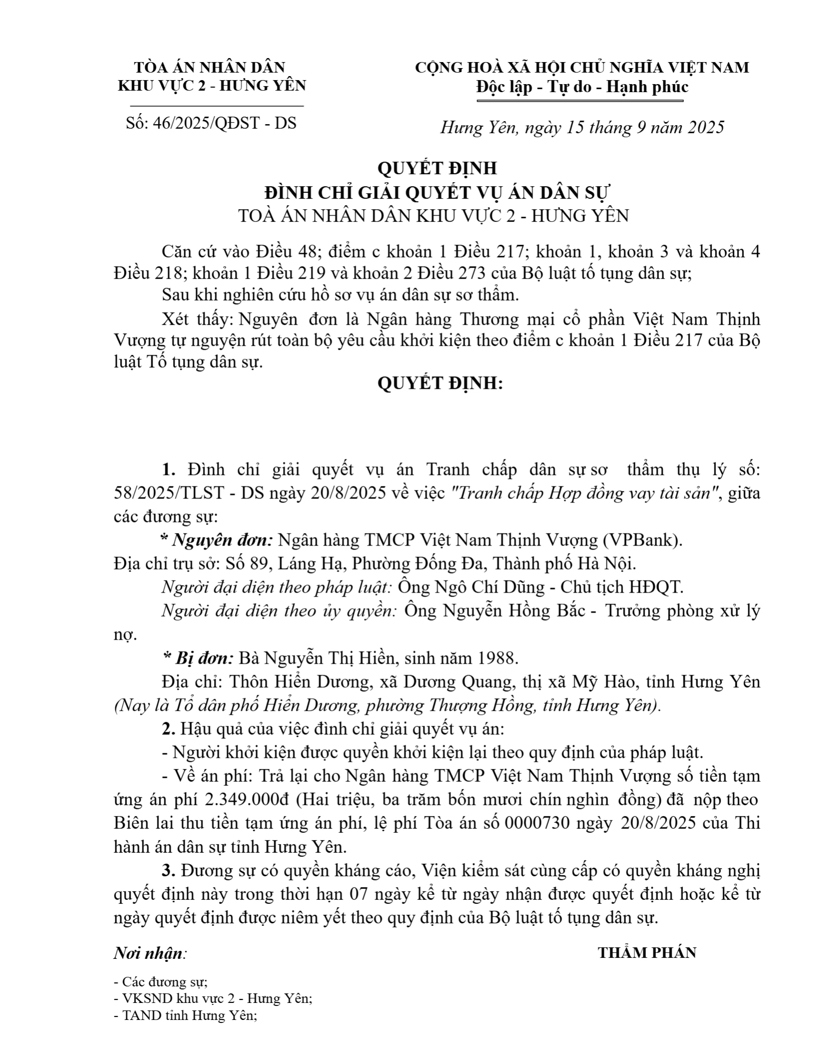 Quyết định số 46/2025/QĐST-DS ngày 15/09/2025 của Tòa án nhân dân khu vực 2 - Hưng Yên, tỉnh Hưng Yên về tranh chấp hợp đồng vay tài sản