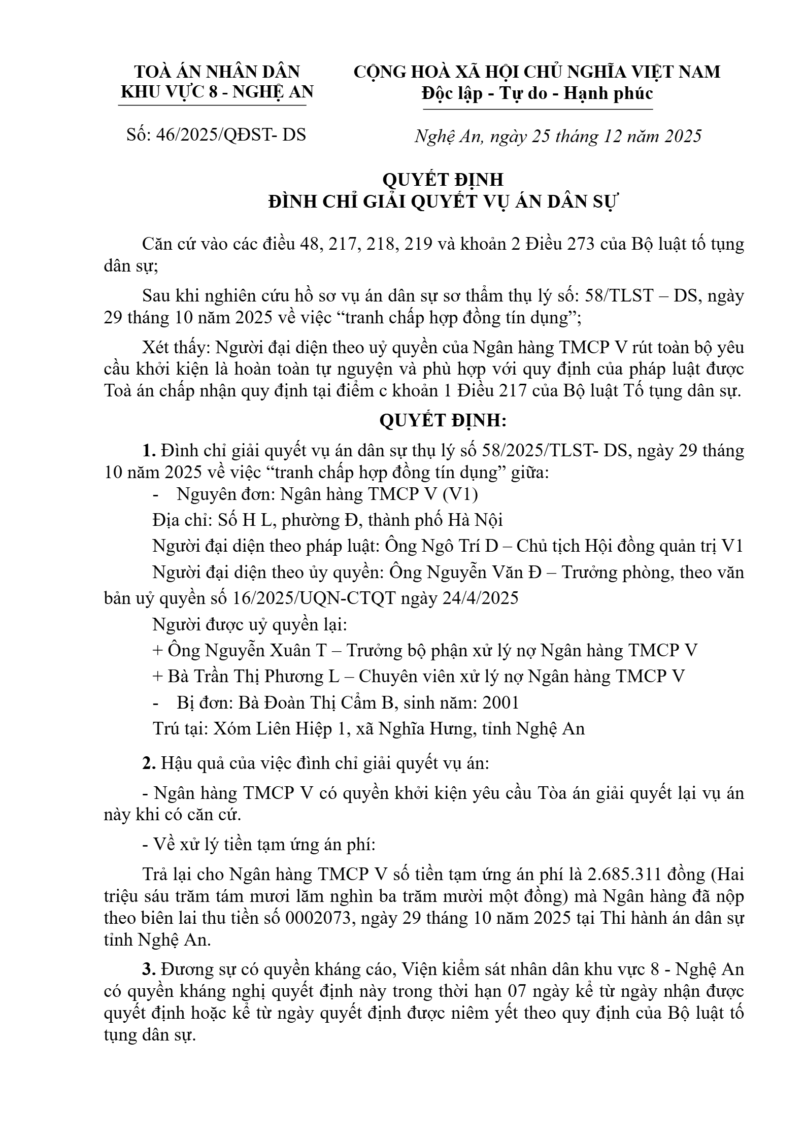 Quyết định số 46/2025/QĐST-DS ngày 25/12/2025 của Tòa án nhân dân khu vực 8 - Nghệ An, tỉnh Nghệ An về tranh chấp hợp đồng tín dụng