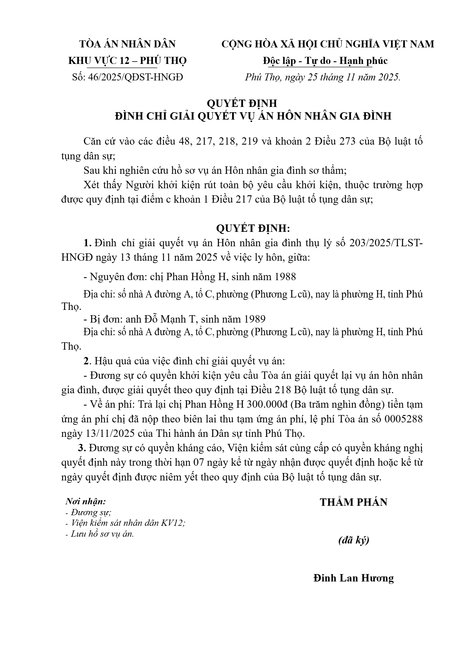Quyết định số 46/2025/QĐST-HNGĐ ngày 04/12/2025 của Tòa án nhân dân khu vực 12 - Phú Thọ, tỉnh Phú Thọ về vụ án ly hôn về mâu thuẫn gia đình