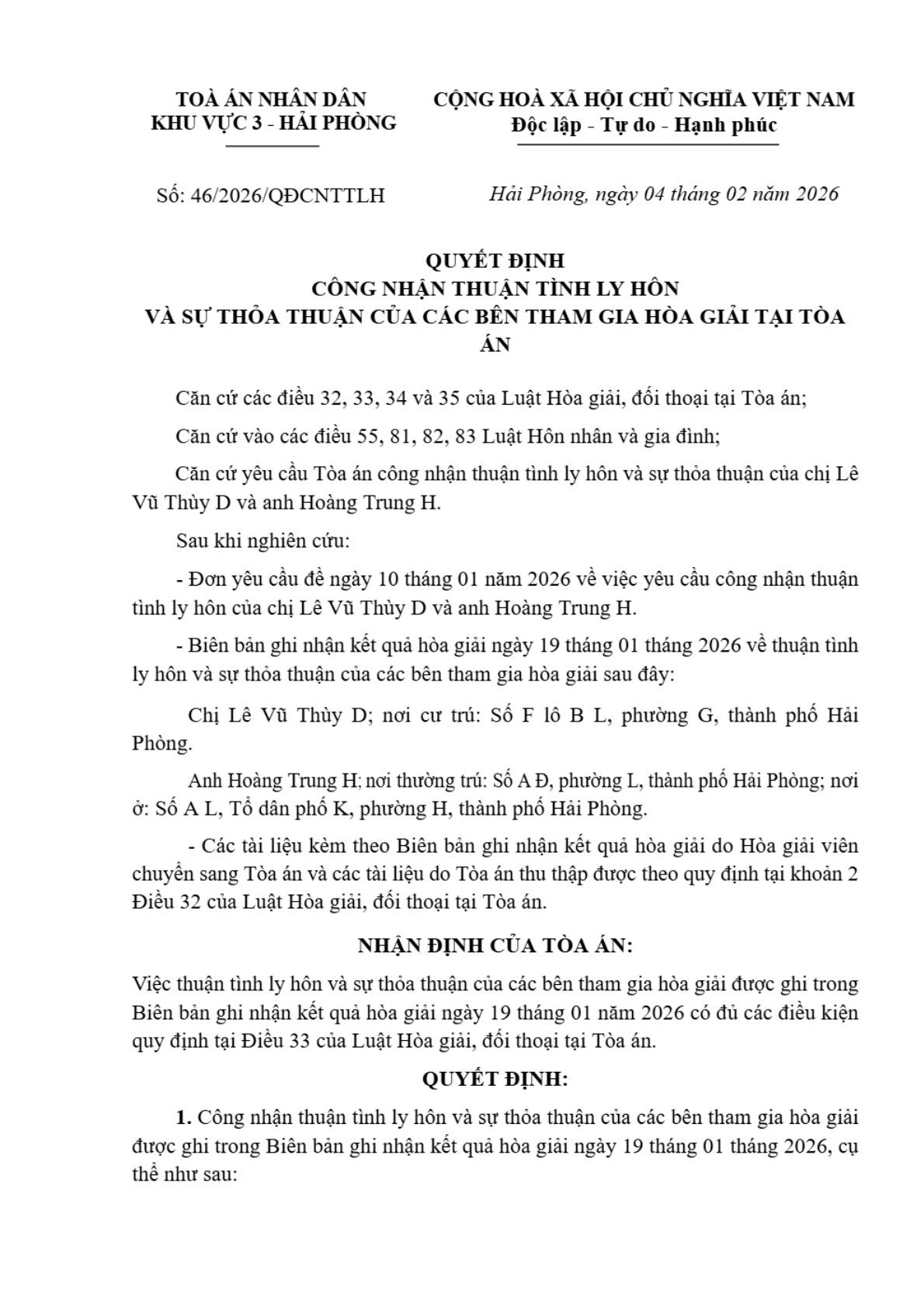| Tên Quyết định: | Quyết định số 46/2026 ngày 04/02/2026 của Tòa án nhân dân khu vực 3 - Hải Phòng, TP. Hải Phòng về yêu cầu công nhận thuận tình ly hôn |