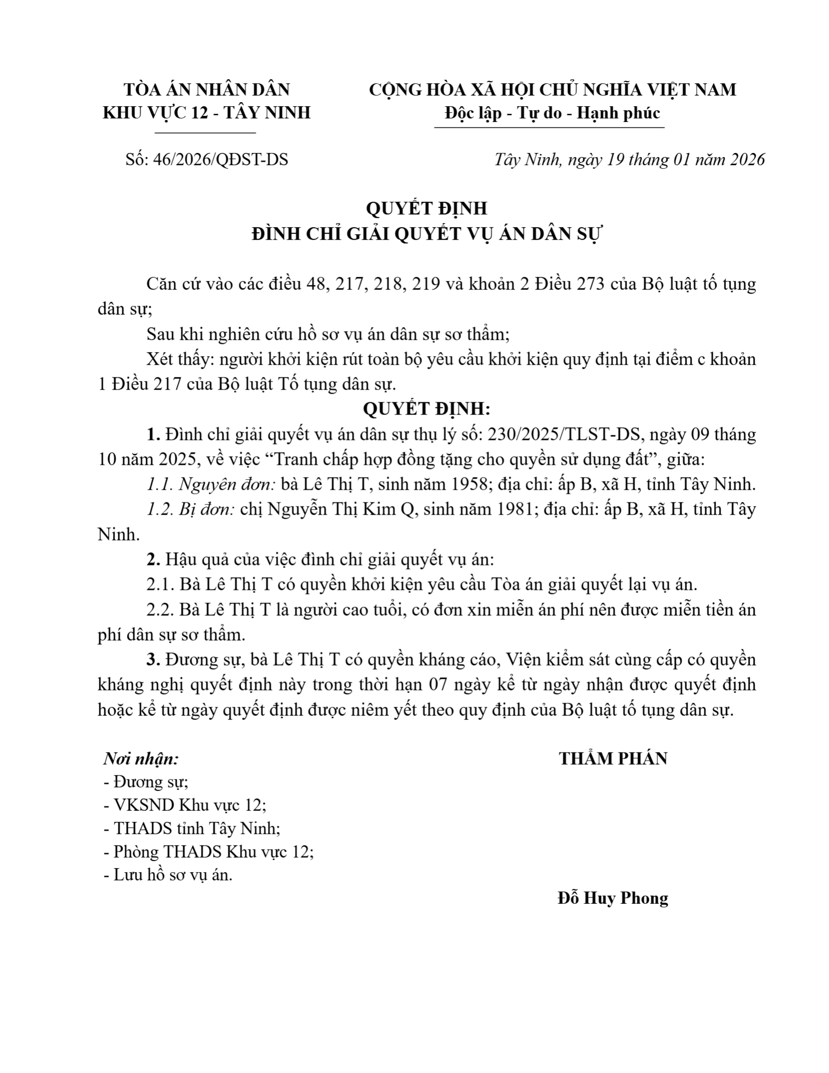 Quyết định số 46/2026/QĐST-DS ngày 19/01/2026 của Tòa án nhân dân khu vực 12 - Tây Ninh, tỉnh Tây Ninh về tranh chấp hợp đồng tặng cho tài sản