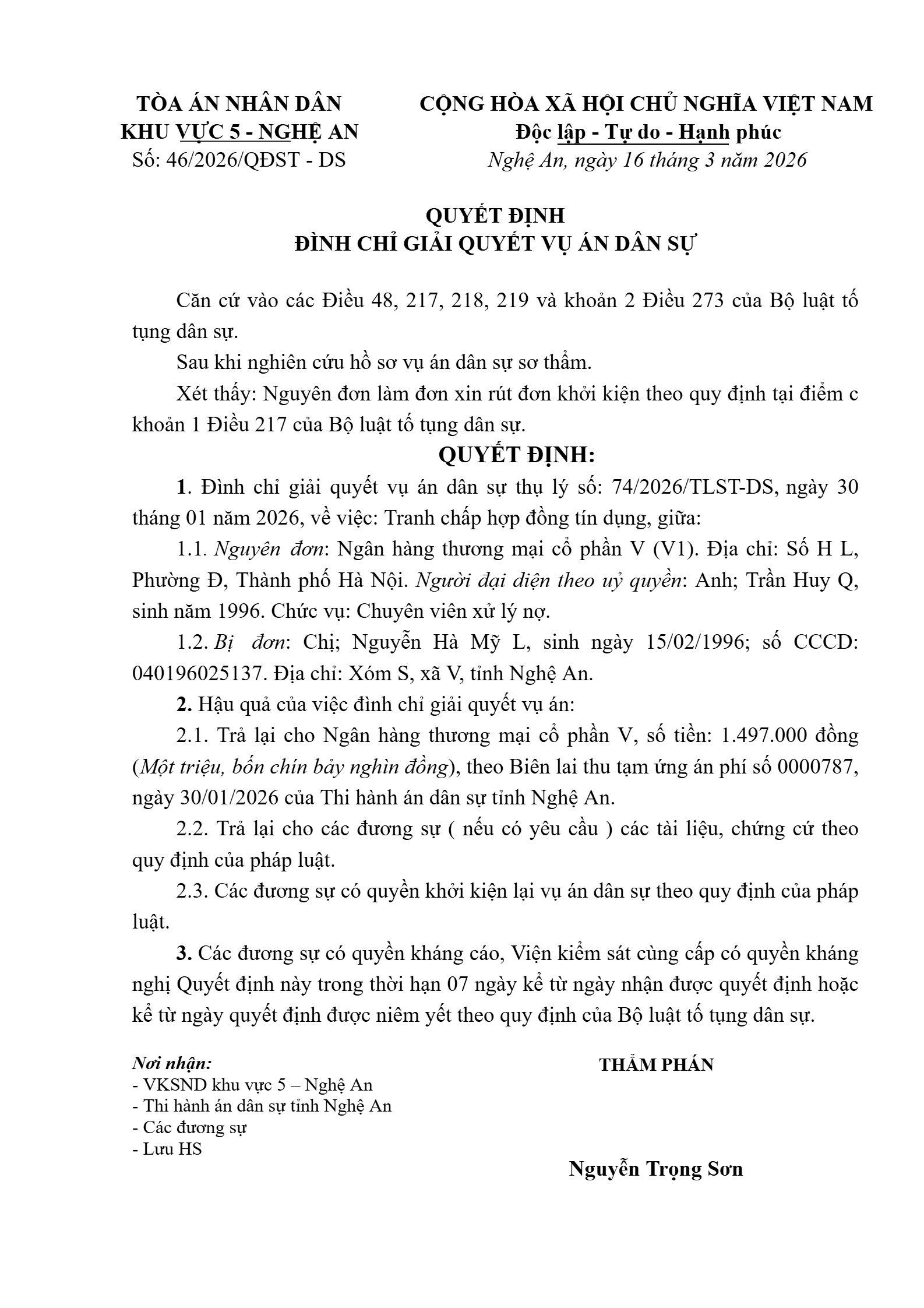 Quyết định số 46/2026/QĐST-DS ngày 16/03/2026 của Tòa án nhân dân khu vực 5 - Nghệ An, tỉnh Nghệ An về tranh chấp hợp đồng tín dụng