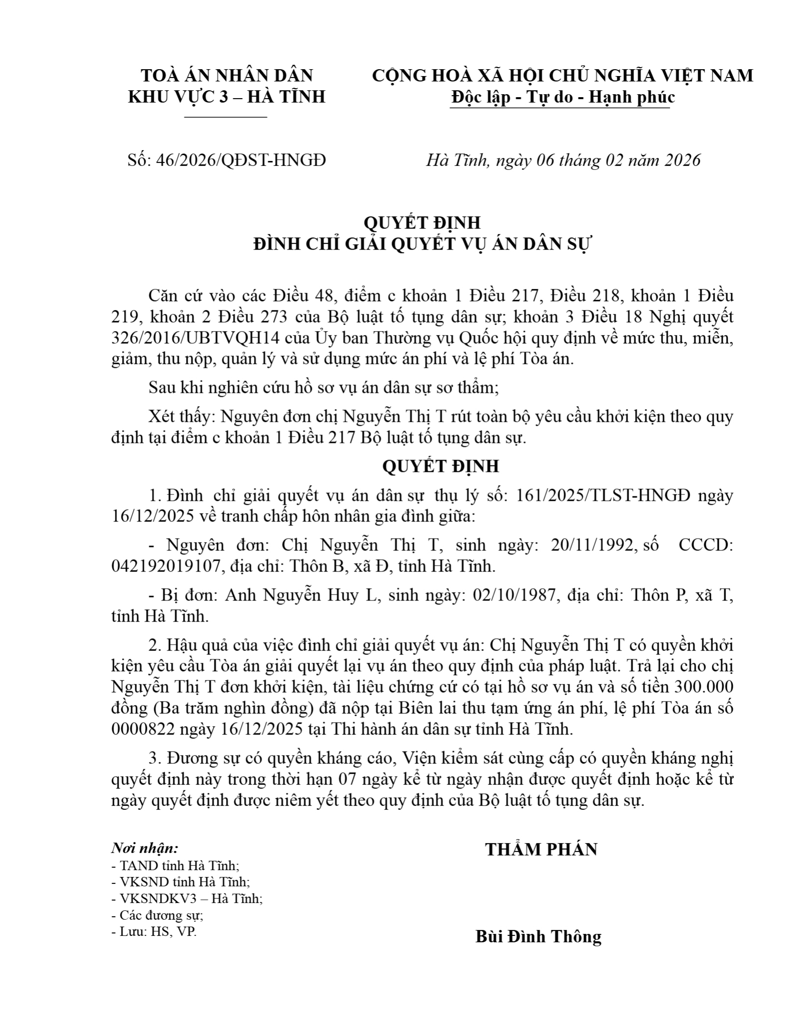 Quyết định số 46/2026/QĐST-HNGĐ ngày 06/02/2026 của Tòa án nhân dân khu vực 3 - Hà Tĩnh, tỉnh Hà Tĩnh về vụ án ly hôn về mâu thuẫn gia đình