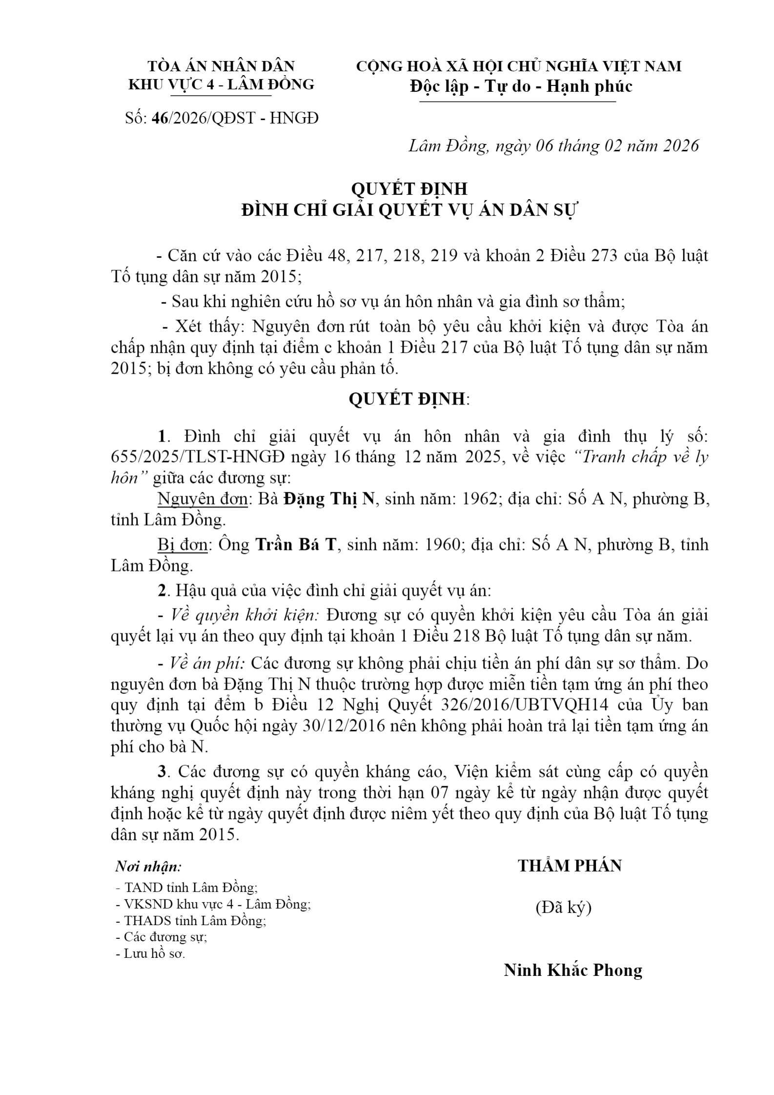 Quyết định số 46/2026/QĐST-HNGĐ ngày 06/02/2026 của Tòa án nhân dân khu vực 4 - Lâm Đồng, tỉnh Lâm Đồng về vụ án ly hôn về mâu thuẫn gia đình