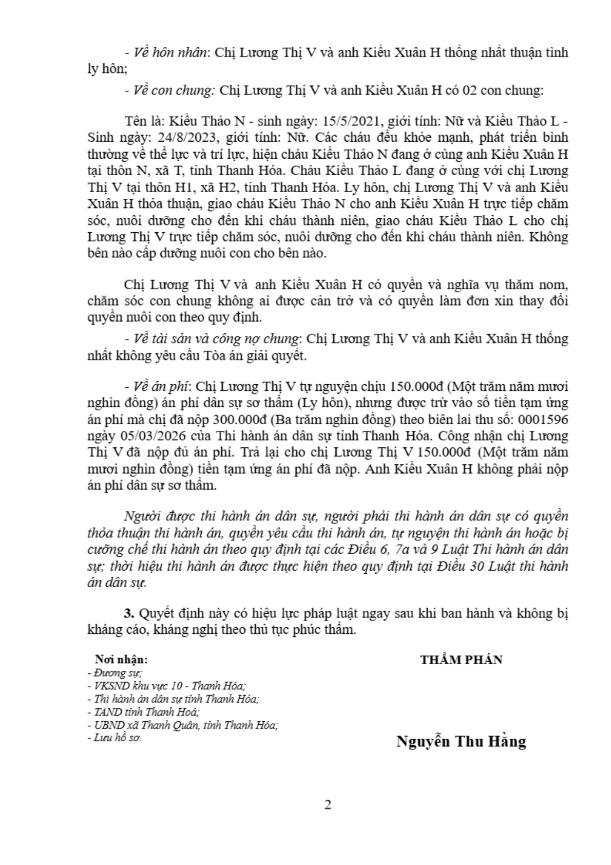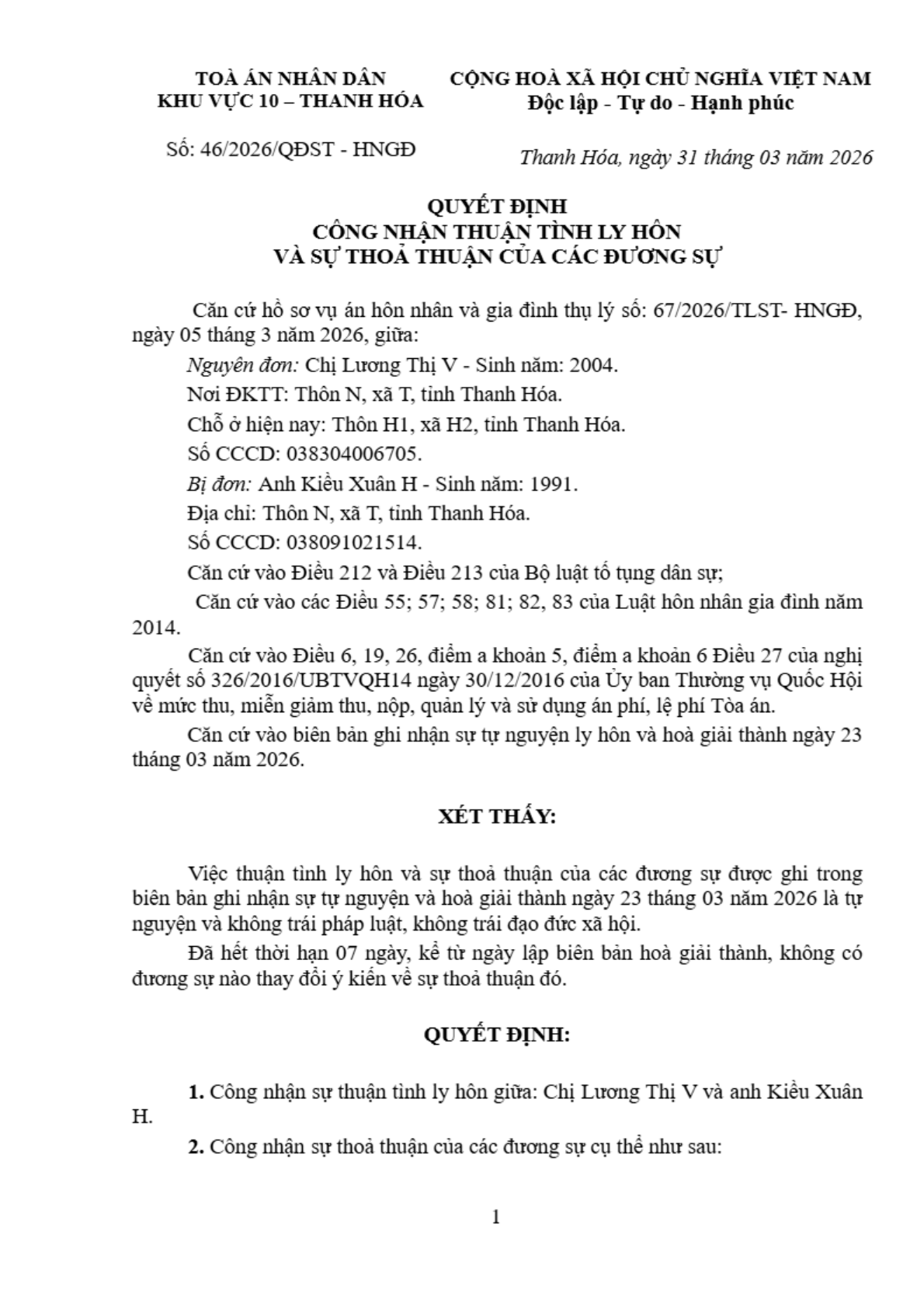 Quyết định số 46/2026/QĐST-HNGĐ ngày 31/03/2026 của Tòa án nhân dân khu vực 10 - Thanh Hóa, tỉnh Thanh Hóa về vụ án ly hôn về mâu thuẫn gia đình