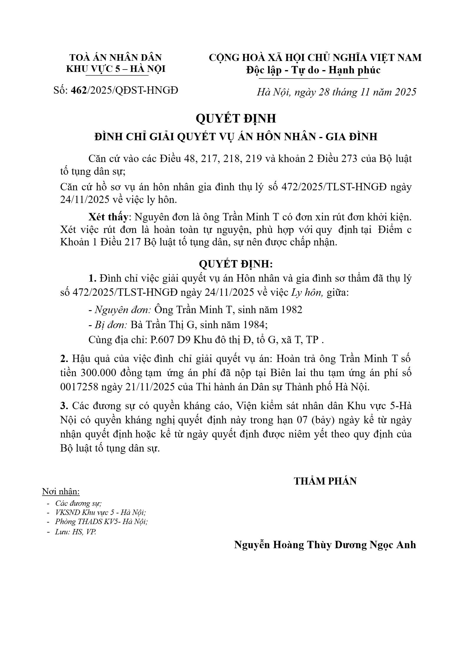 Quyết định số 462/2025/QĐST-HNGĐ ngày 28/11/2025 của Tòa án nhân dân khu vực 5 - Hà Nội, TP. Hà Nội về vụ án ly hôn về mâu thuẫn gia đình