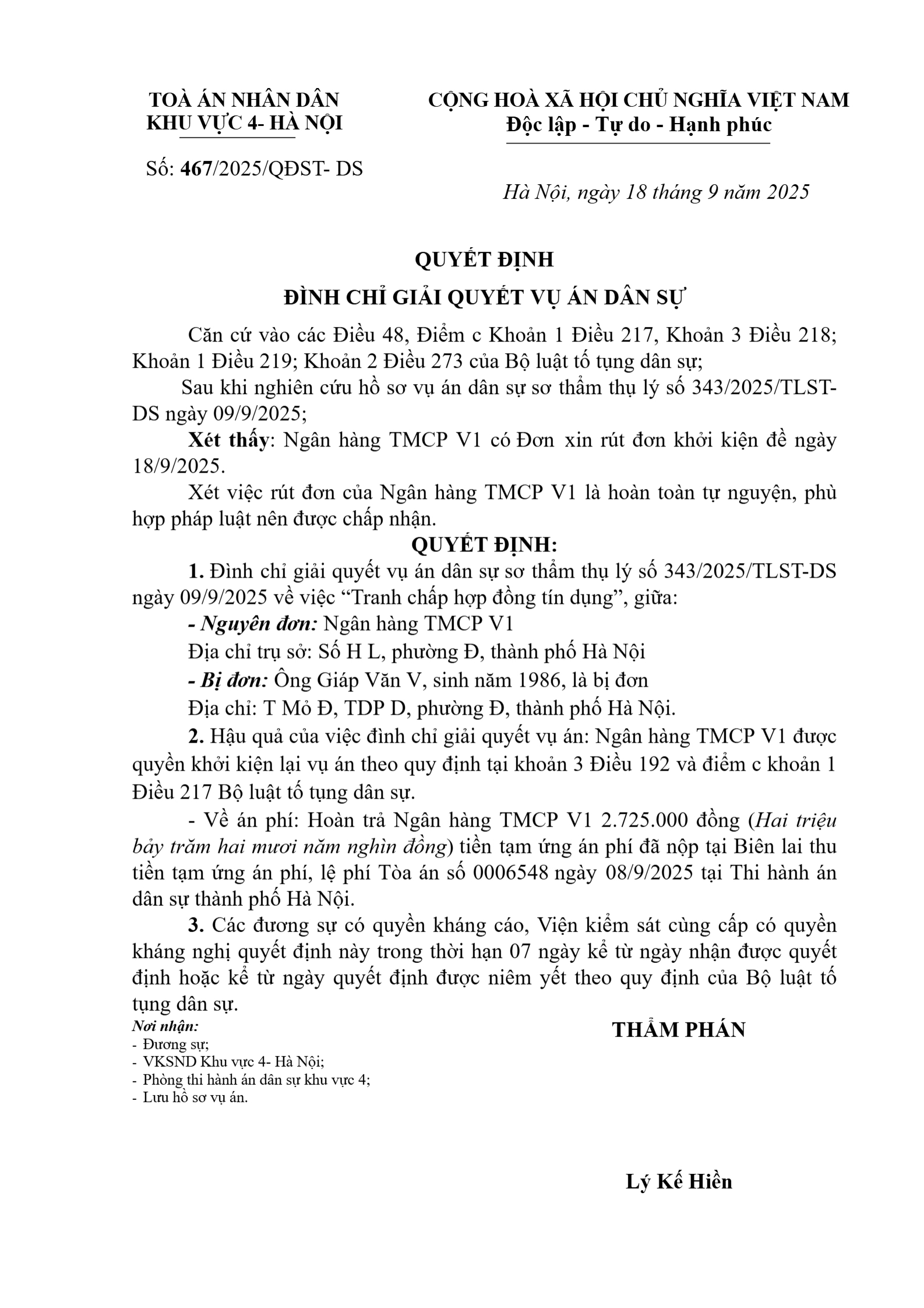 | Tên Quyết định: | Quyết định số 467/2026/QĐST-DS ngày 03/03/2026 của Tòa án nhân dân khu vực 4 - Hà Nội, TP. Hà Nội về tranh chấp hợp đồng tín dụng |