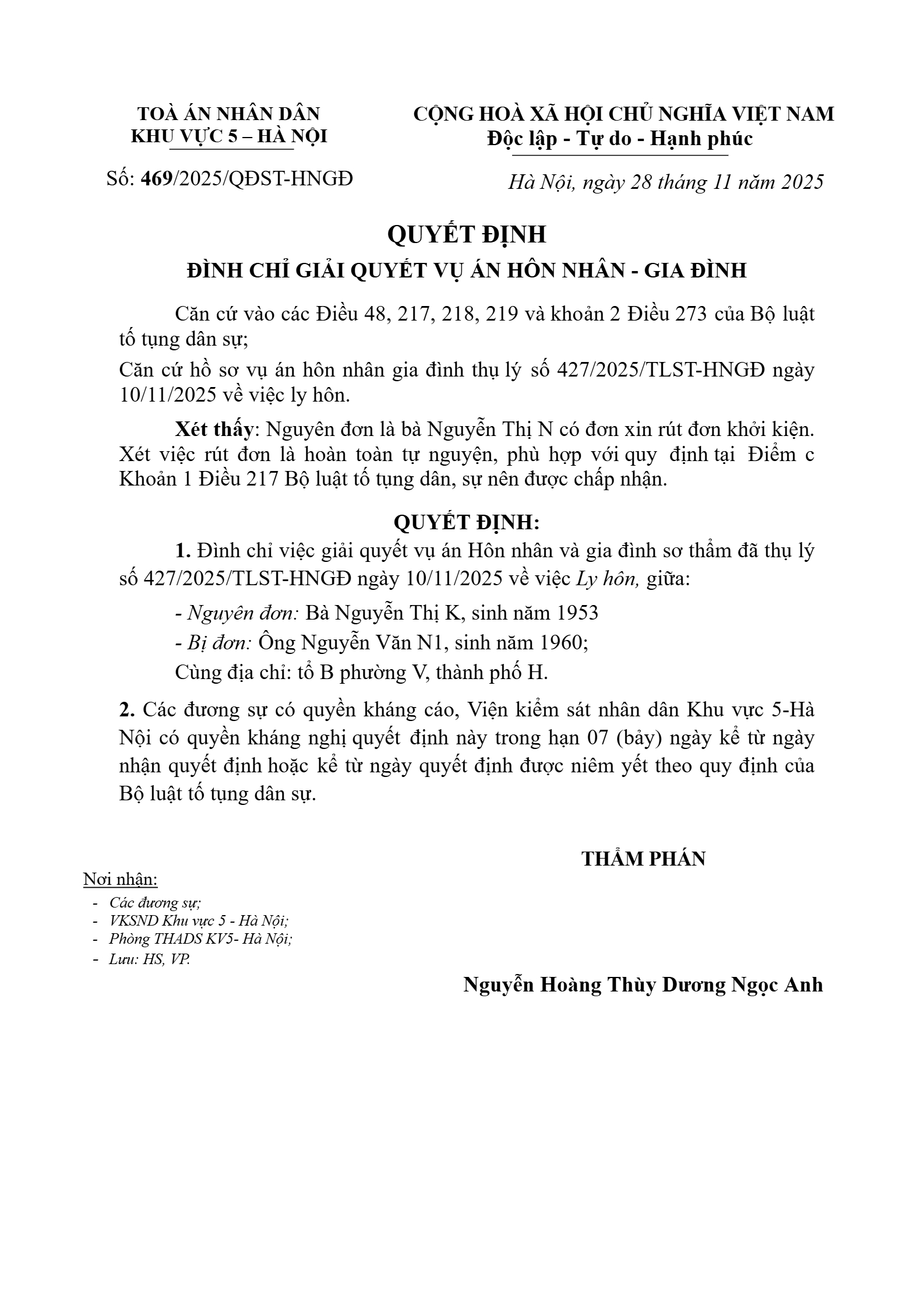 Quyết định số 469/2025/QĐST-HNGĐ