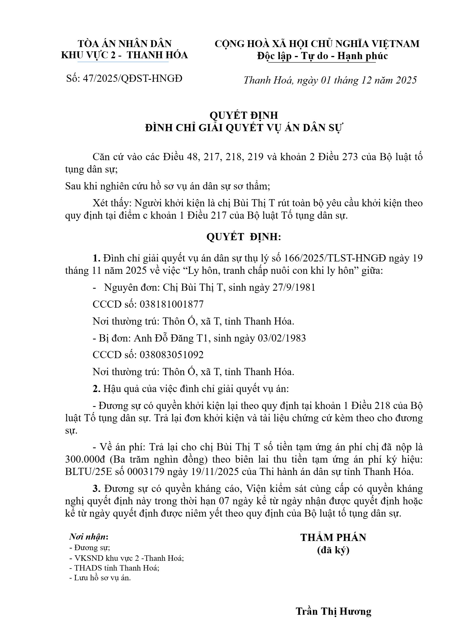 Quyết định số 47/2025 ngày 01/12/2025 của Tòa án nhân dân khu vực 2 - Thanh Hóa, tỉnh Thanh Hóa về vụ án ly hôn về mâu thuẫn gia đình