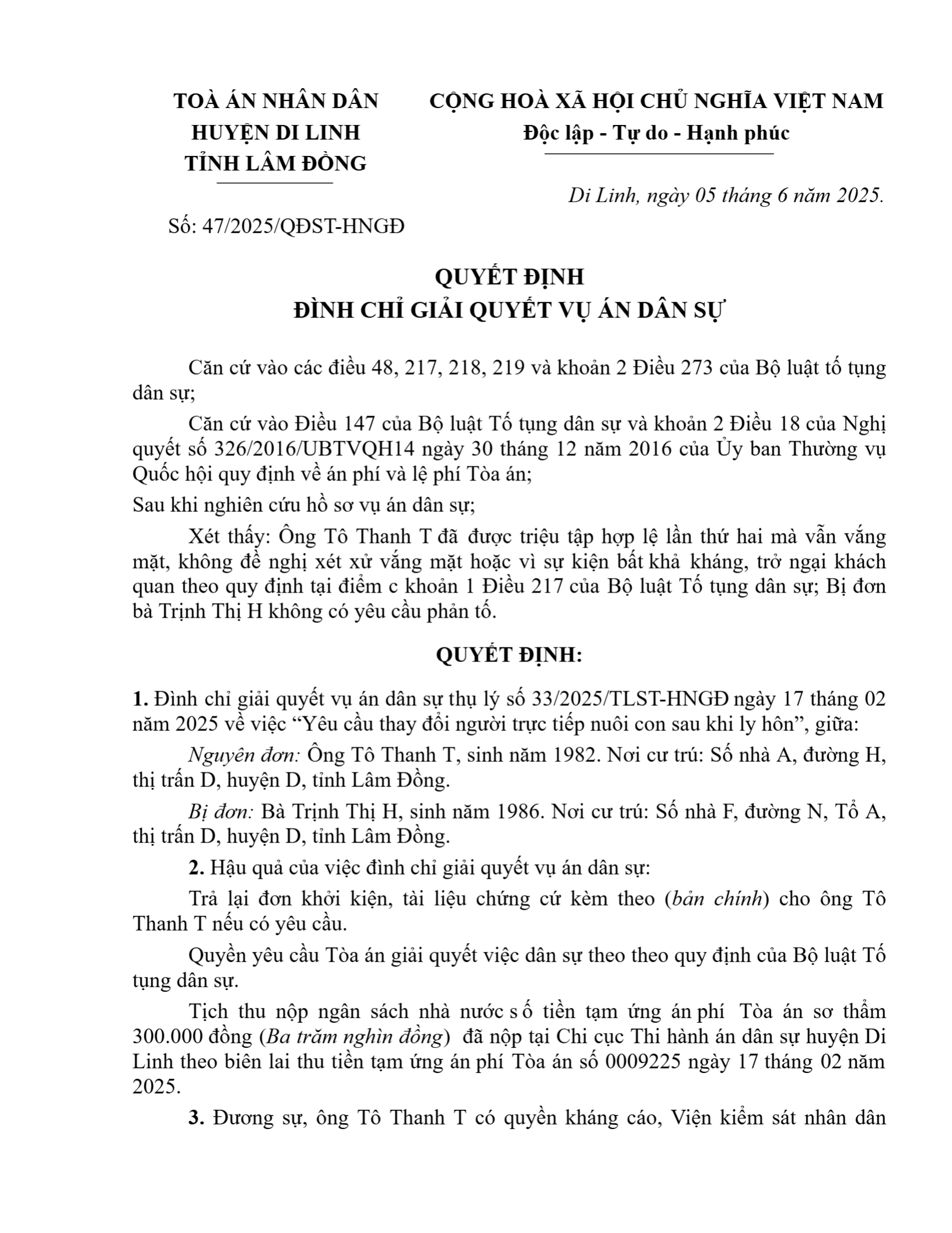 | Tên Quyết định: | Quyết định số 47/2025/QĐST-HNGĐ ngày 05/06/2025 của TAND huyện Di Linh, tỉnh Lâm Đồng về tranh chấp về thay đổi người trực tiếp nuôi con sau khi ly hôn |