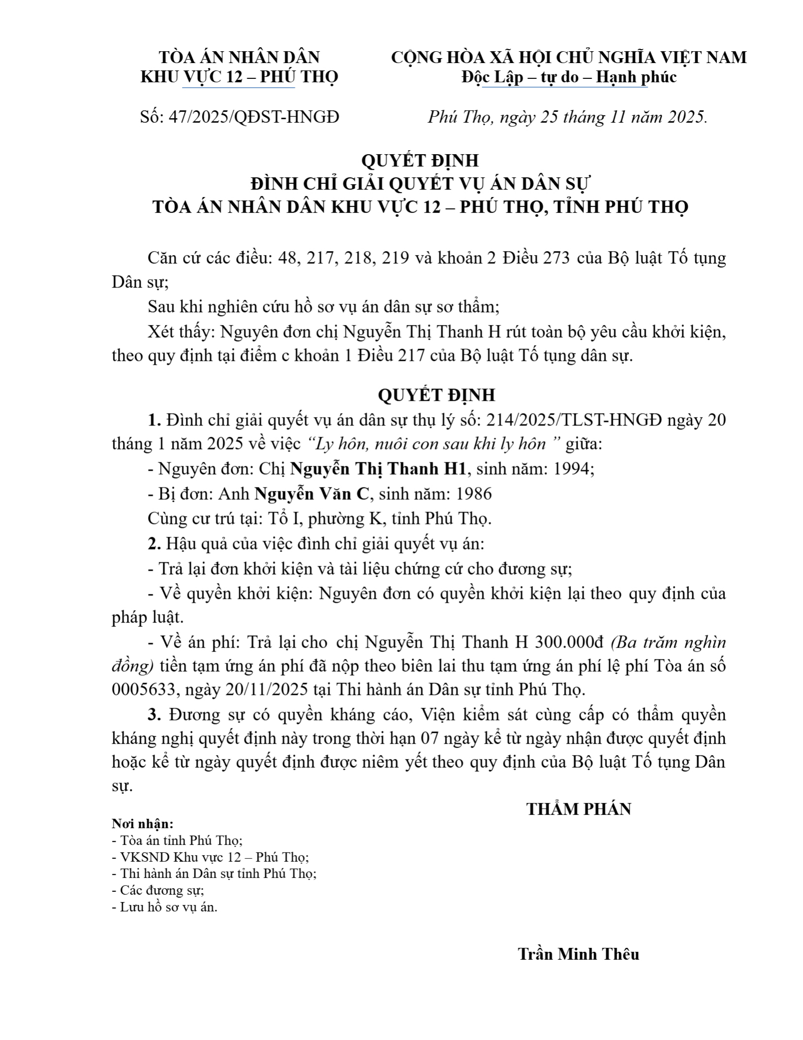 Quyết định số 47/2025/QĐST-HNGĐ ngày 25/11/2025 của Tòa án nhân dân khu vực 12 - Phú Thọ, tỉnh Phú Thọ về vụ án ly hôn về mâu thuẫn gia đình