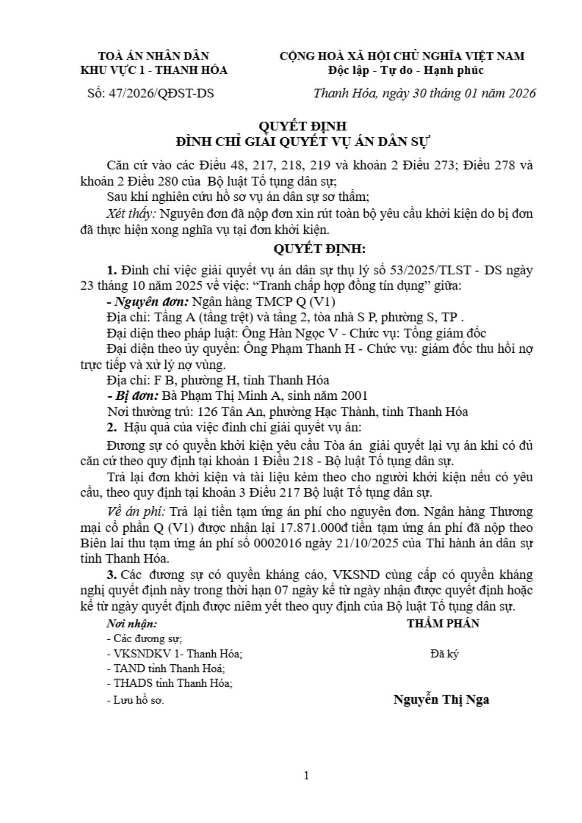 Quyết định số 47/2026/QĐST-DS ngày 30/01/2026 của Tòa án nhân dân khu vực 1 - Thanh Hóa, tỉnh Thanh Hóa về tranh chấp hợp đồng tín dụng