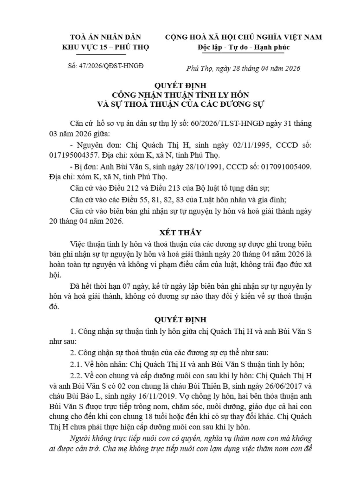 | Thông tin về vụ/việc: | Quyết định 47/2026/QĐST-HNGĐ |
