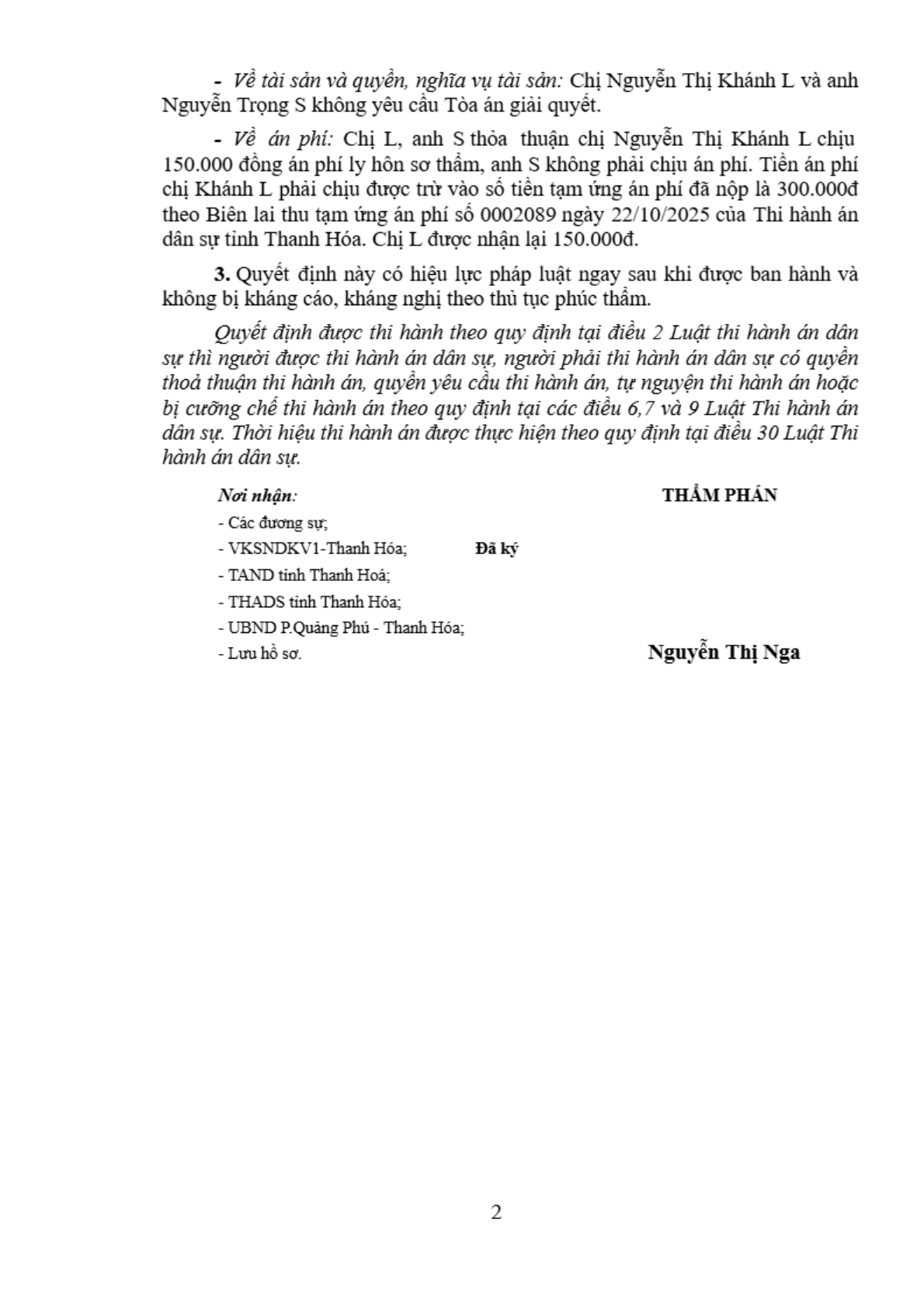 | Thông tin về vụ/việc: | Nguyễn Thị Khánh L - Nguyễn Trọng S (Ly hôn) |