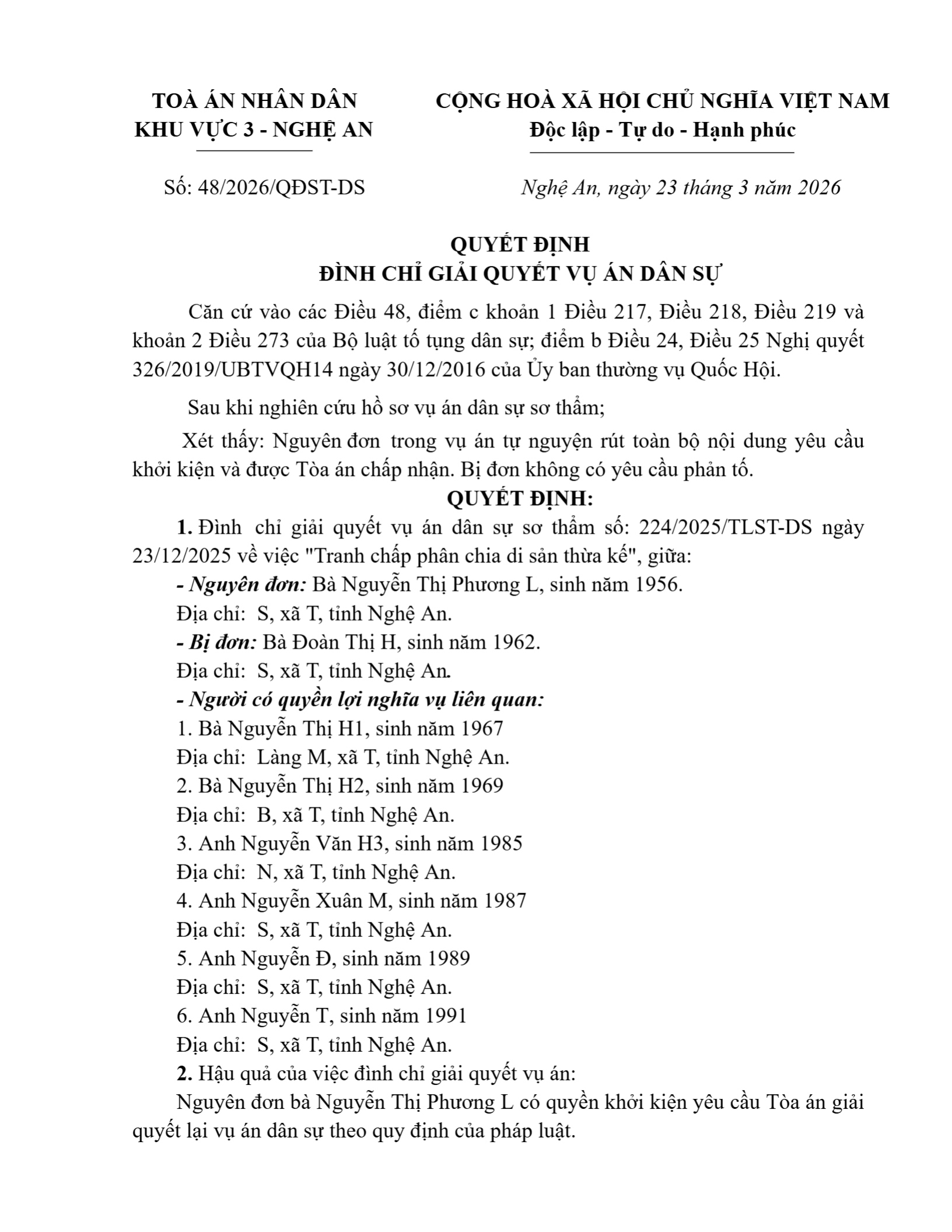 Quyết định số 48/2026/QĐST-DS ngày 23/03/2026 của Tòa án nhân dân khu vực 3 - Nghệ An, tỉnh Nghệ An về tranh chấp về thừa kế tài sản