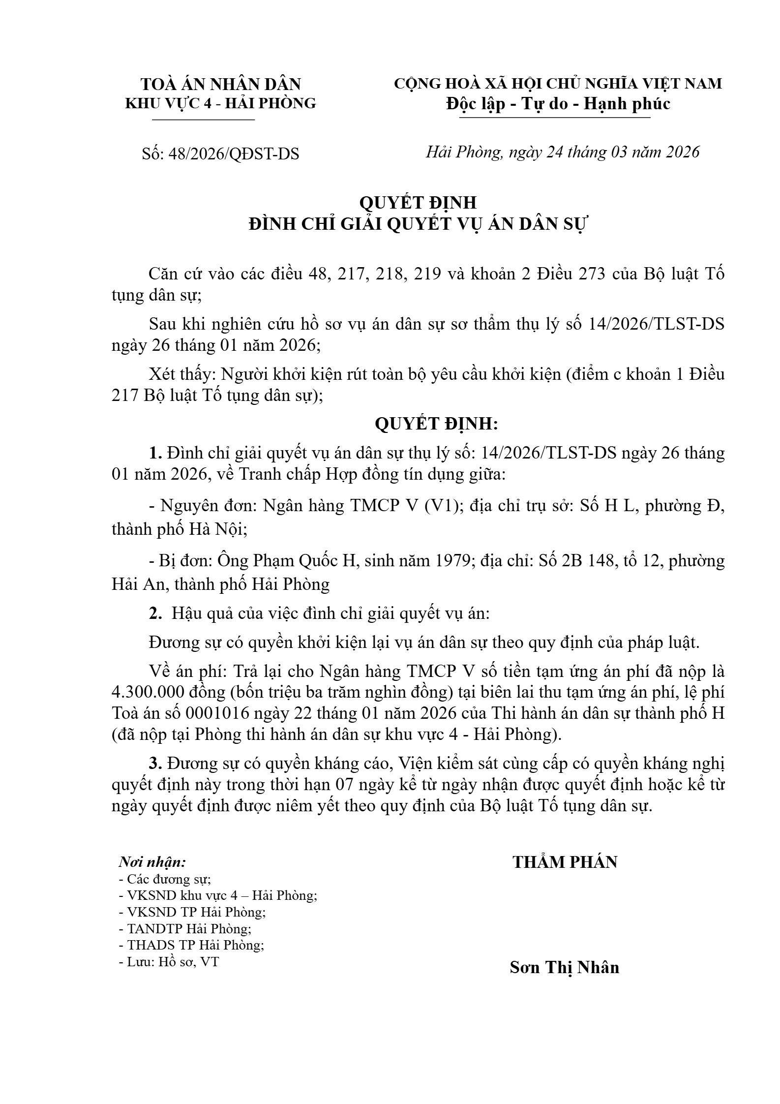 Quyết định số 48/2026/QĐST-DS ngày 24/03/2026 của Tòa án nhân dân khu vực 4 - Hải Phòng, TP. Hải Phòng về tranh chấp hợp đồng tín dụng