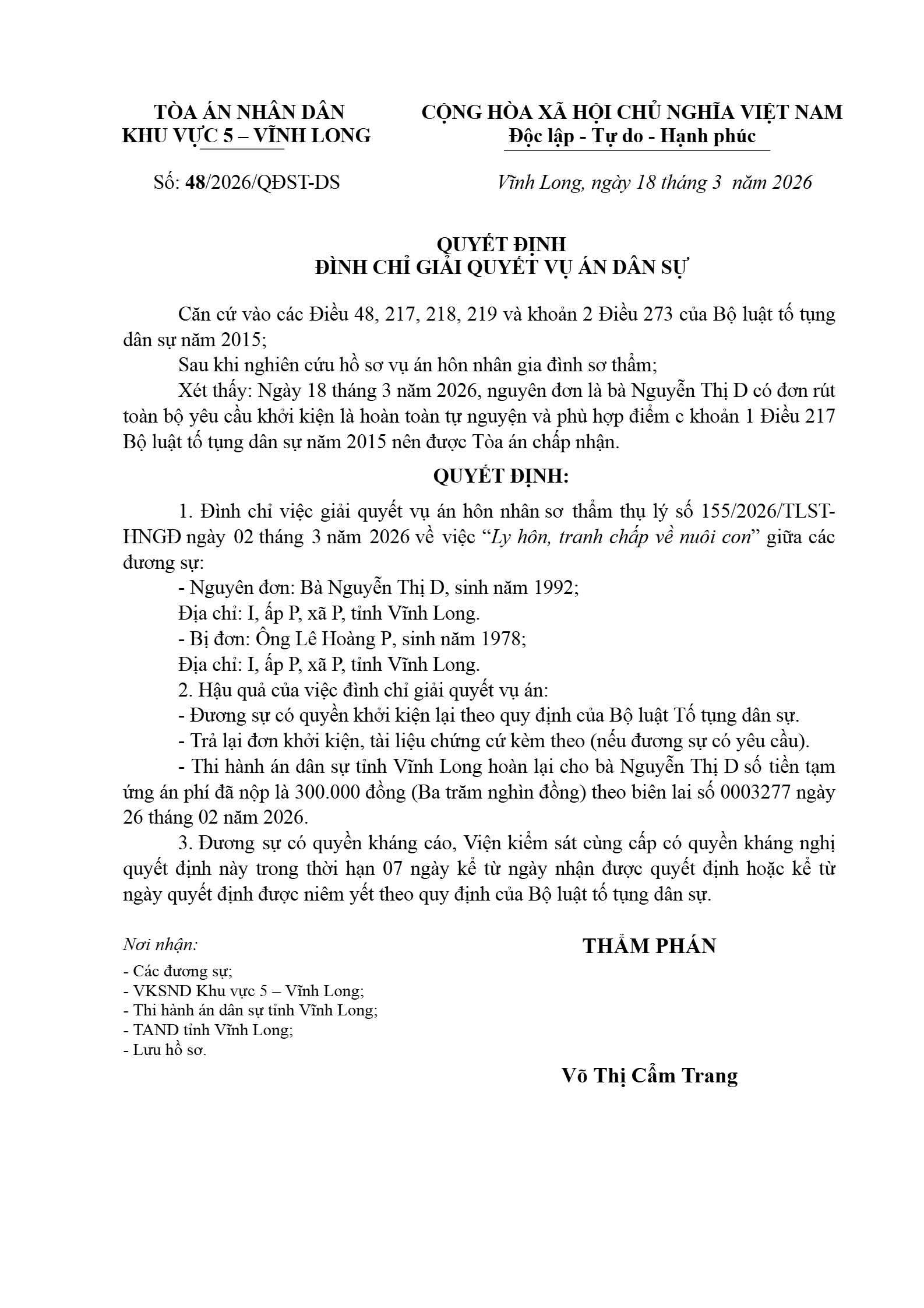 Quyết định số 48/2026/QĐST-HNGĐ ngày 18/03/2026 của Tòa án nhân dân khu vực 5 - Vĩnh Long, tỉnh Vĩnh Long về vụ án ly hôn về mâu thuẫn gia đình