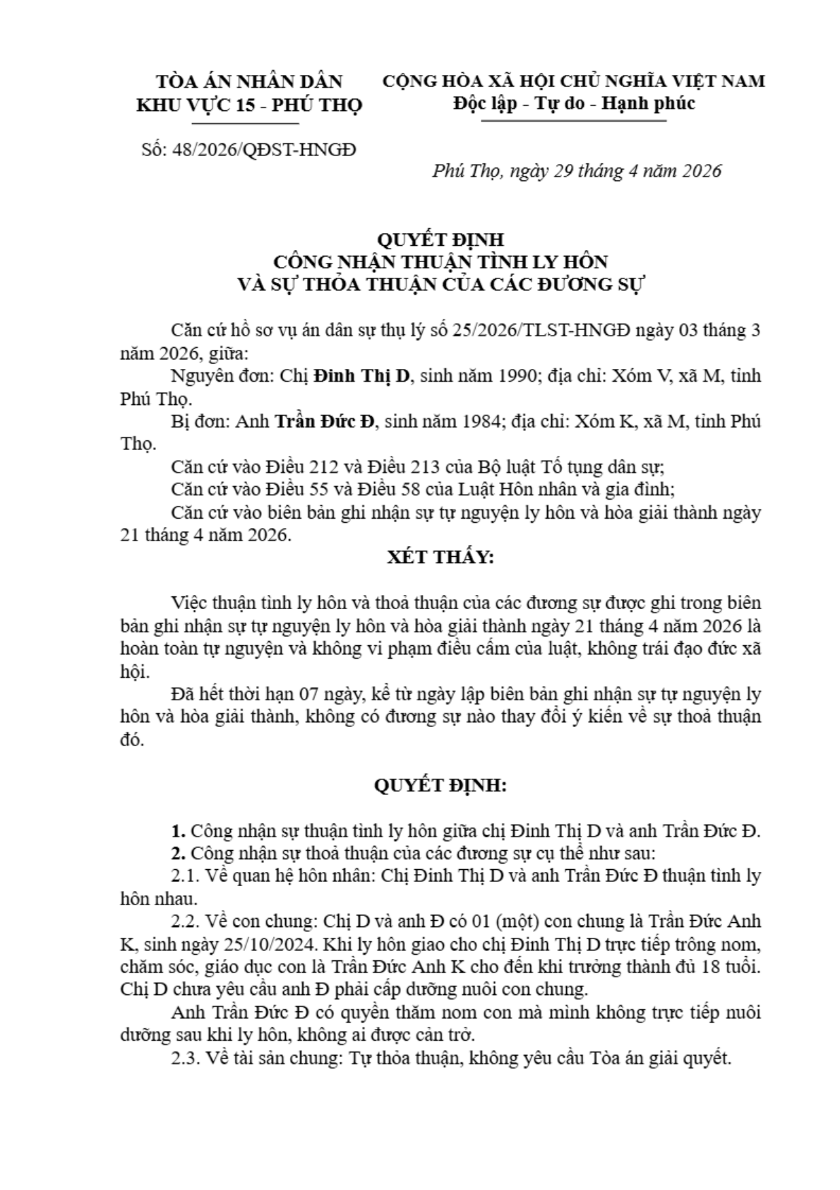 Quyết định số 48/2026/QĐST-HNGĐ ngày 29/04/2026 của Tòa án nhân dân khu vực 15 - Phú Thọ, tỉnh Phú Thọ về vụ án ly hôn về mâu thuẫn gia đình