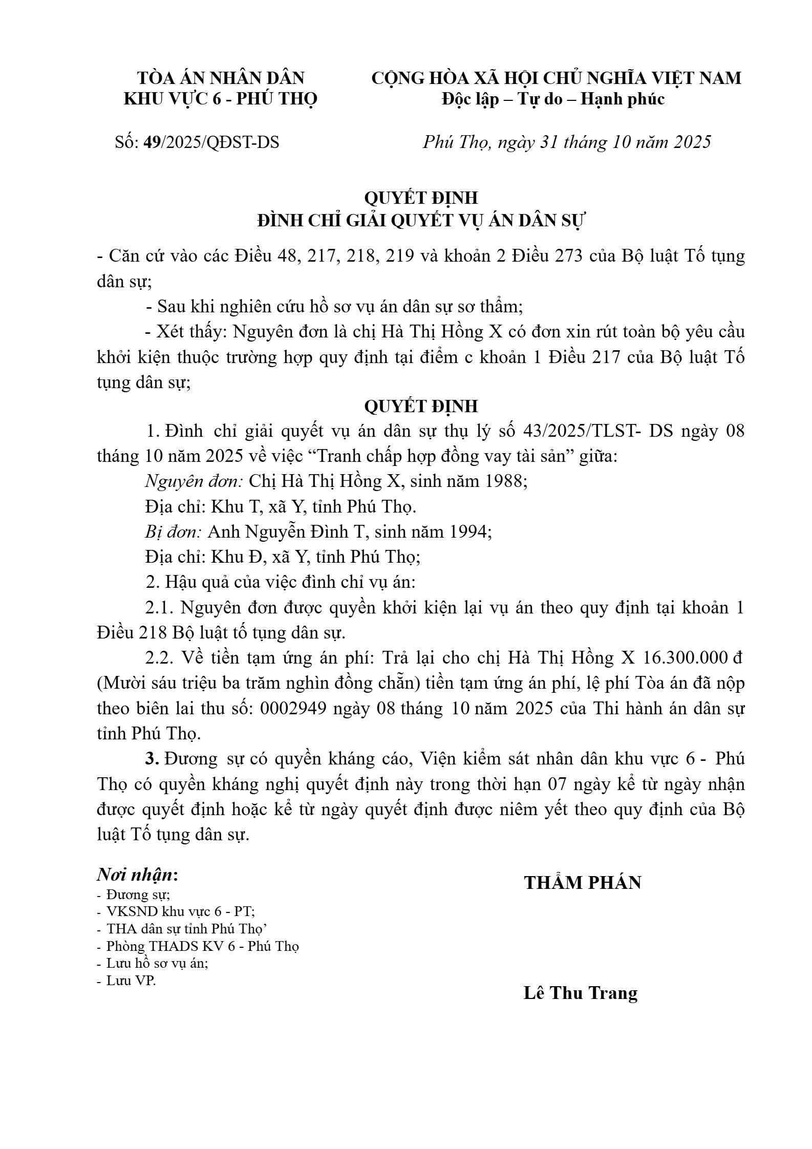 Quyết định số 49/2025/QĐST-DS ngày 31/10/2025 của Tòa án nhân dân khu vực 6 - Phú Thọ, tỉnh Phú Thọ về tranh chấp hợp đồng vay tài sản