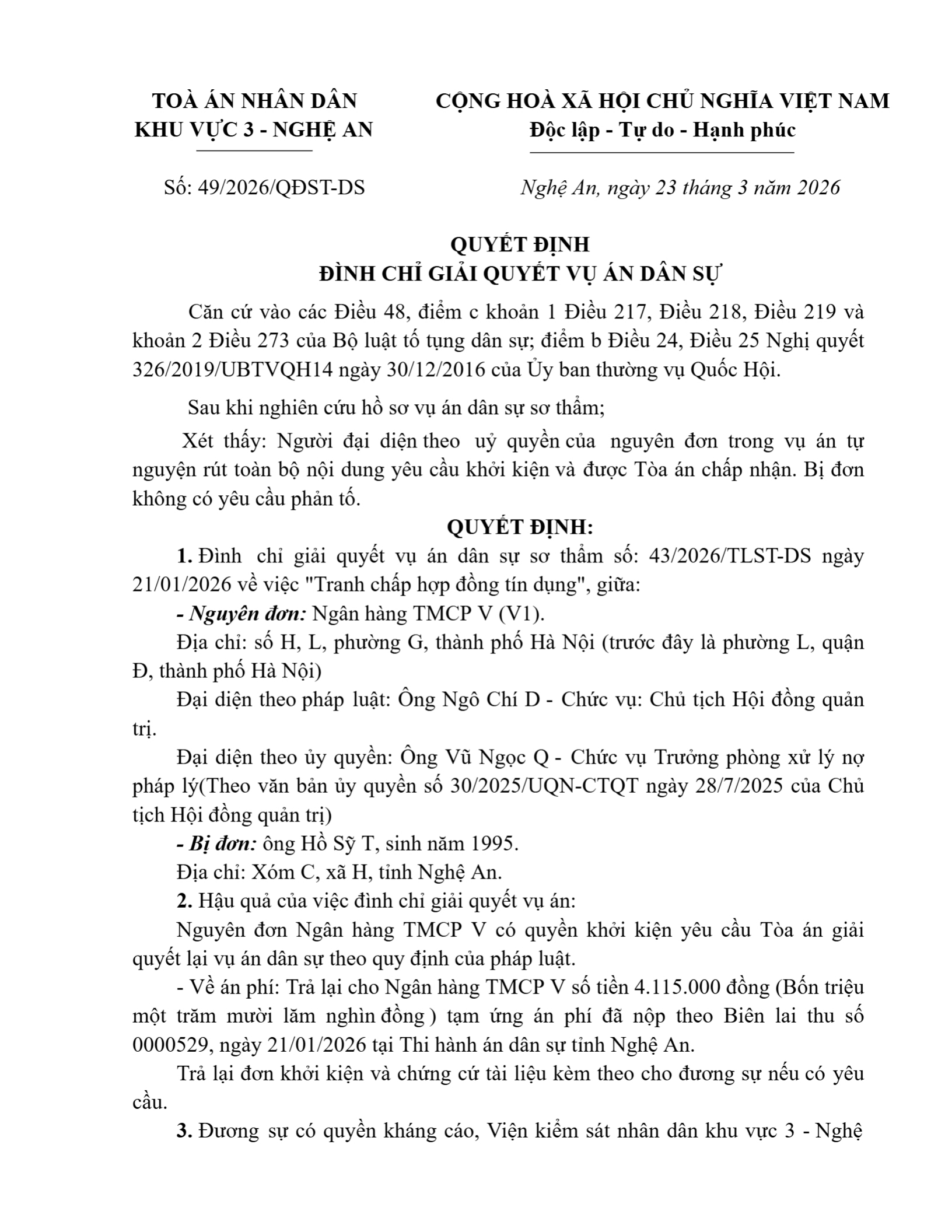 Quyết định số 49/2026/QĐST-DS ngày 23/03/2026 của Tòa án nhân dân khu vực 3 - Nghệ An, tỉnh Nghệ An về tranh chấp hợp đồng tín dụng