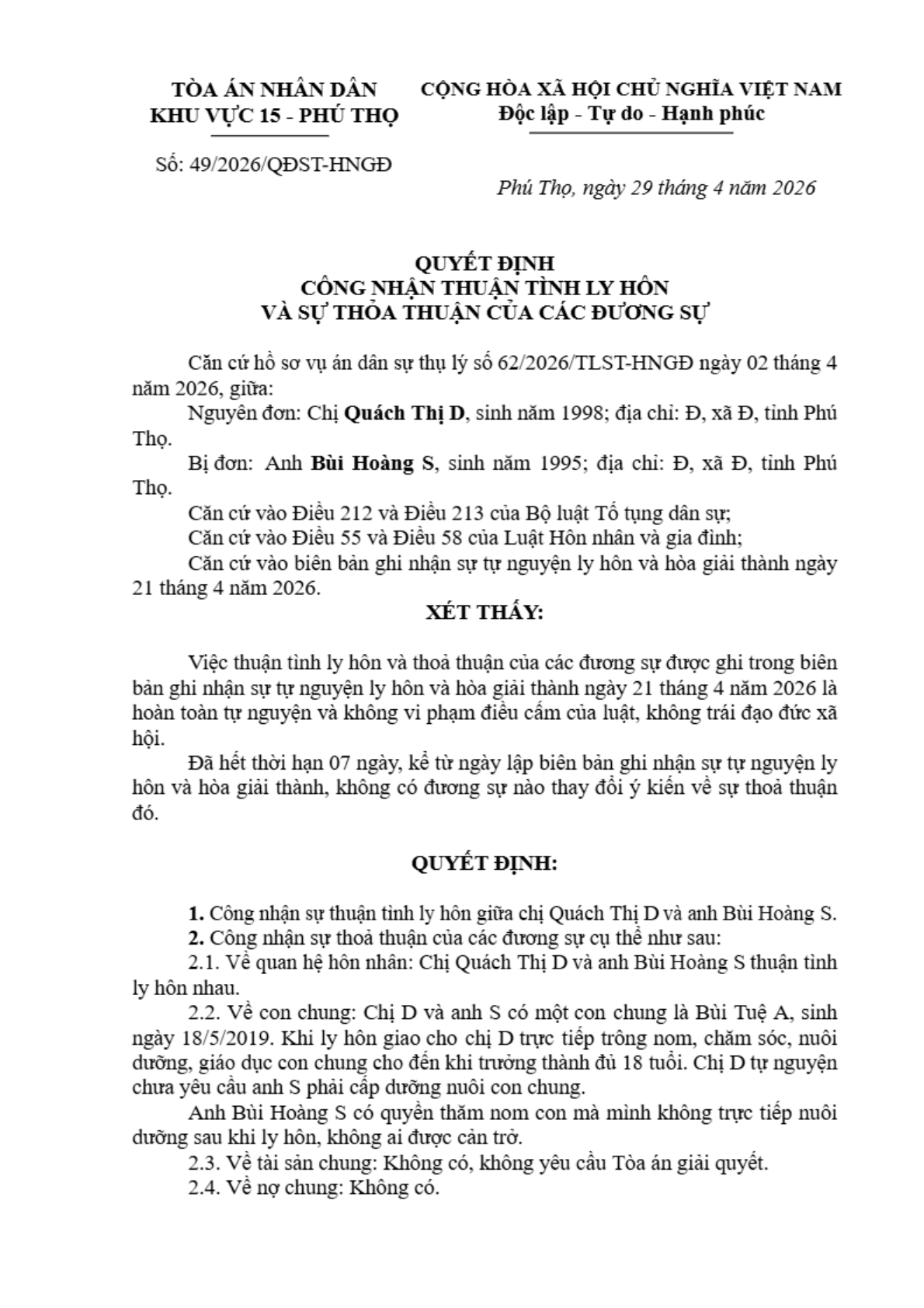 Quyết định số 49/2026/QĐST-HNGĐ ngày 29/04/2026 của Tòa án nhân dân khu vực 15 - Phú Thọ, tỉnh Phú Thọ về vụ án ly hôn về mâu thuẫn gia đình