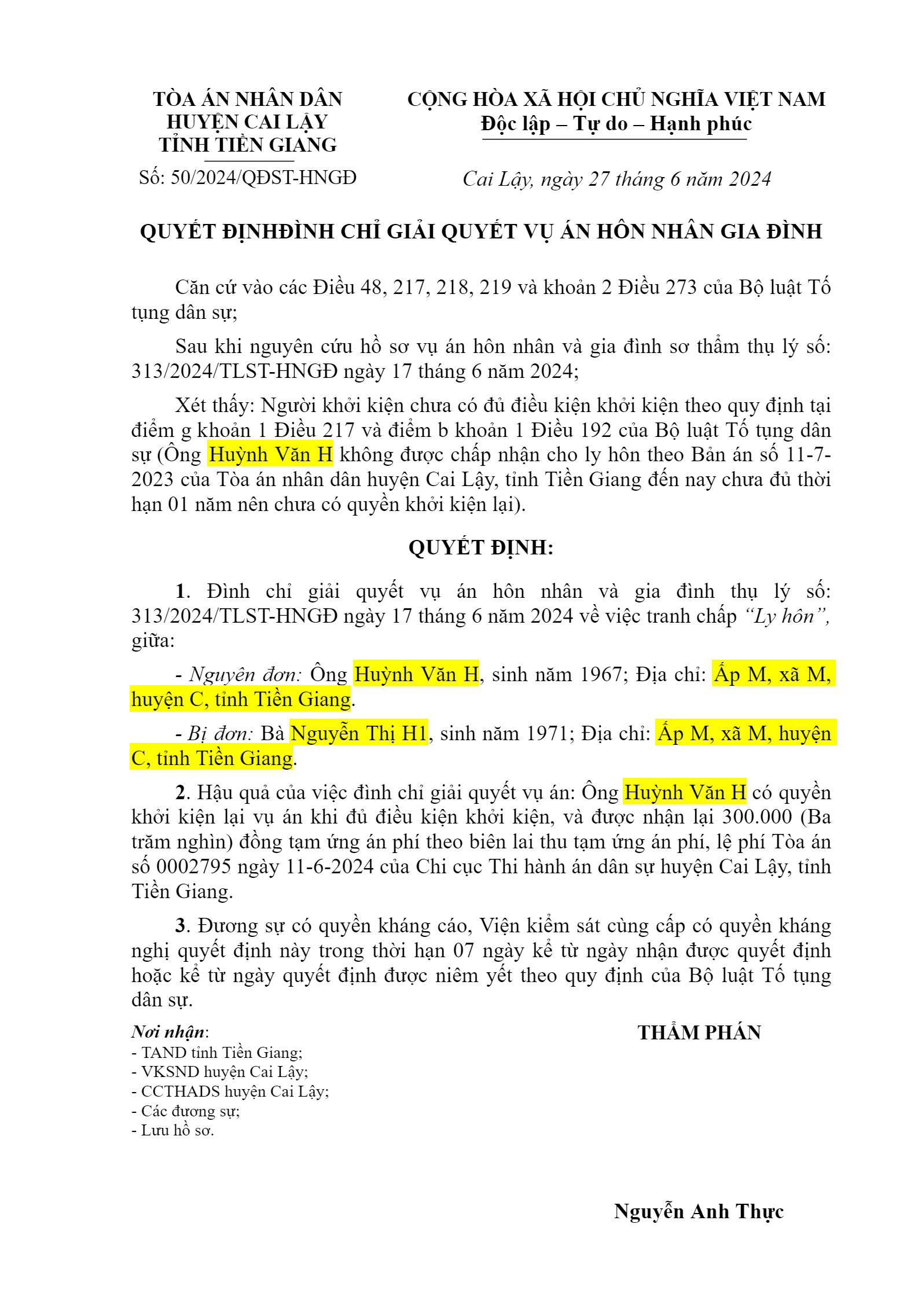 | Tòa án xét xử: | TAND huyện Cai Lậy (TAND tỉnh Tiền Giang) |