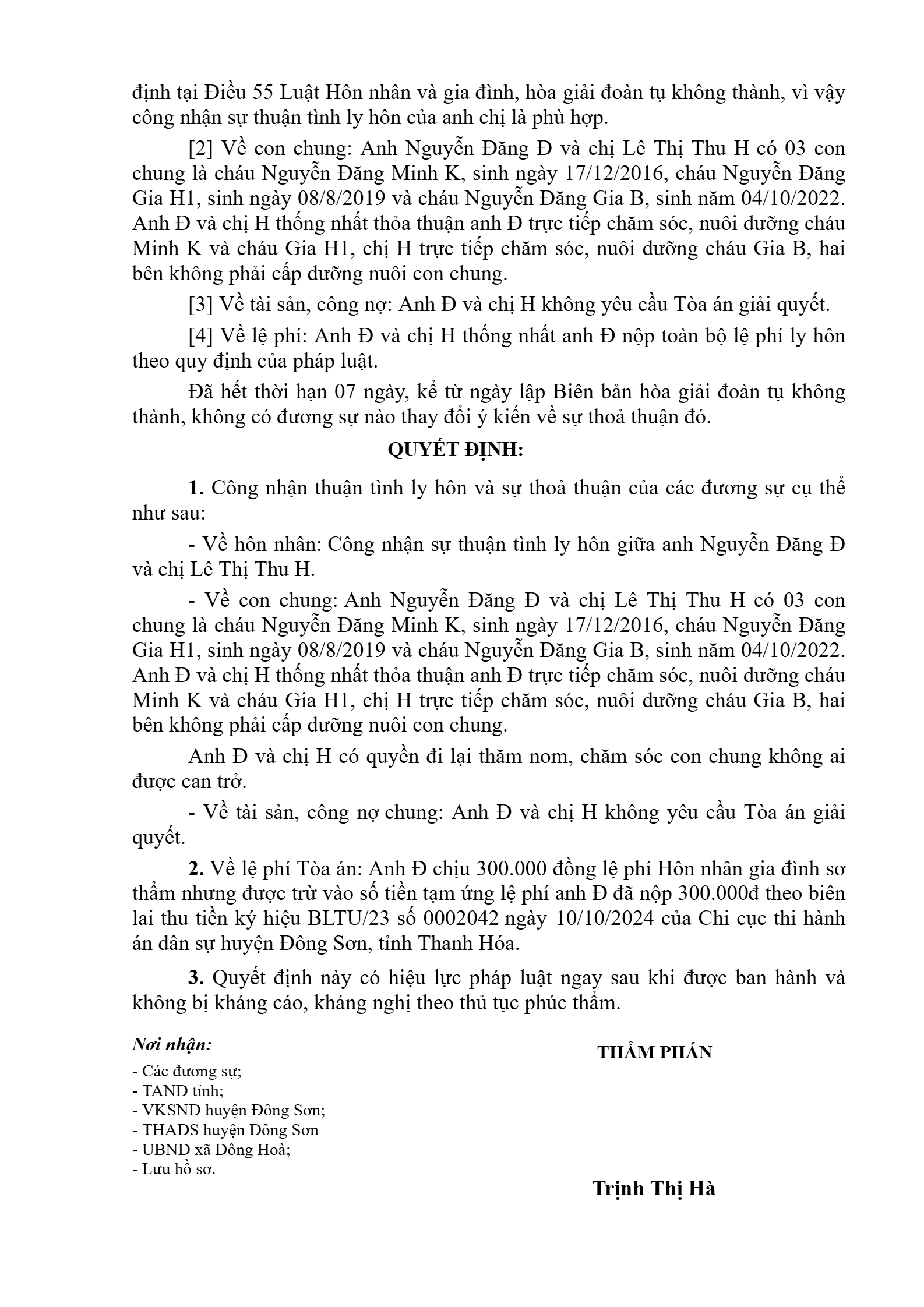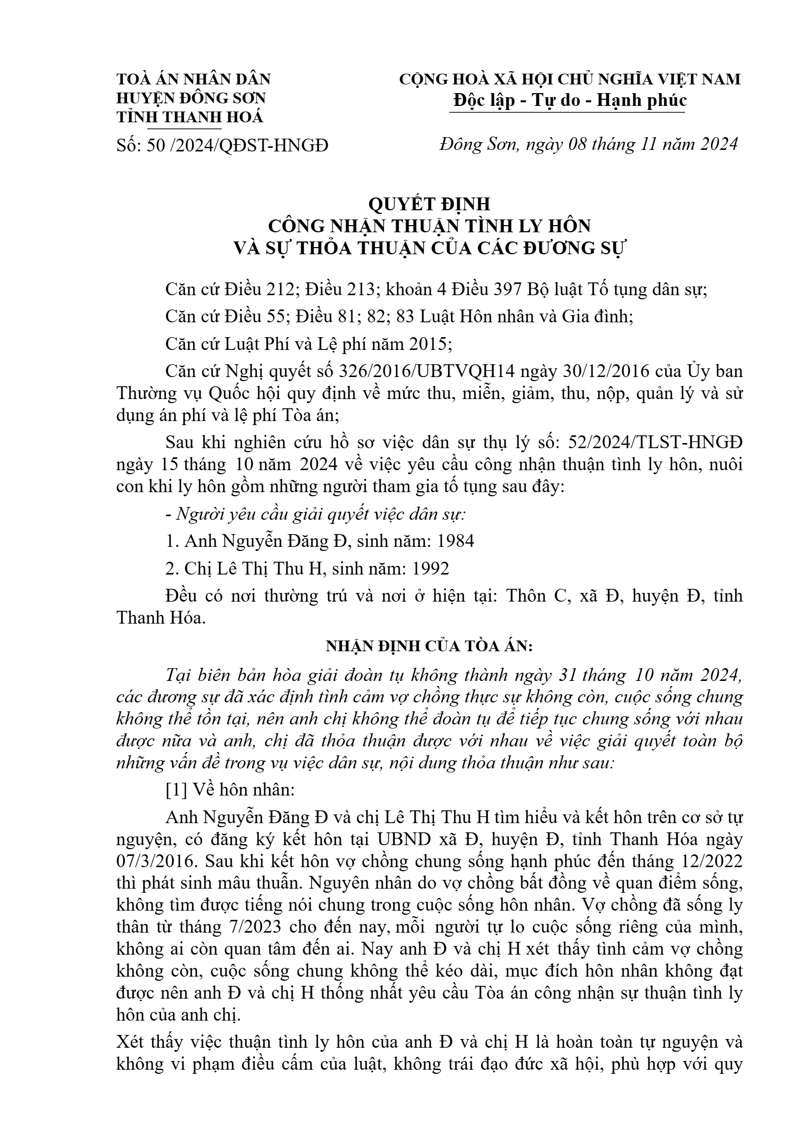 Quyết định số 50/2024/QĐST-HNGĐ ngày 08/11/2024 của TAND huyện Đông Sơn, tỉnh Thanh Hóa về yêu cầu công nhận thuận tình ly hôn
