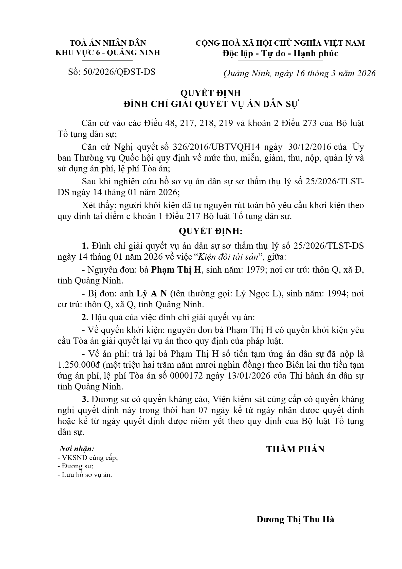 Quyết định số 50/2026/QĐST-DS ngày 16/03/2026 của Tòa án nhân dân khu vực 6 - Quảng Ninh, tỉnh Quảng Ninh về tranh chấp hợp đồng vay tài sản