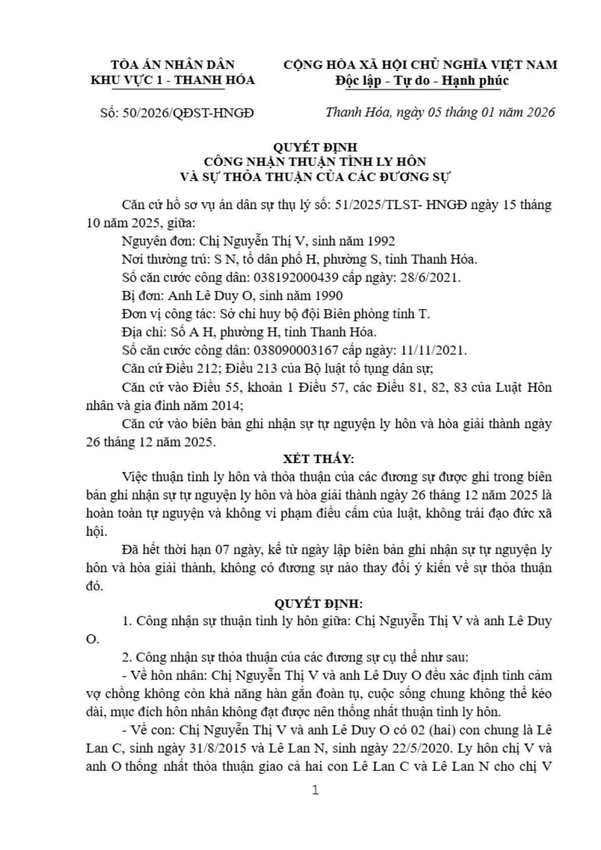 Quyết định số 50/2026/QĐST-HNGĐ ngày 05/01/2026 của Tòa án nhân dân khu vực 1 - Thanh Hóa, tỉnh Thanh Hóa về yêu cầu công nhận thuận tình ly hôn
