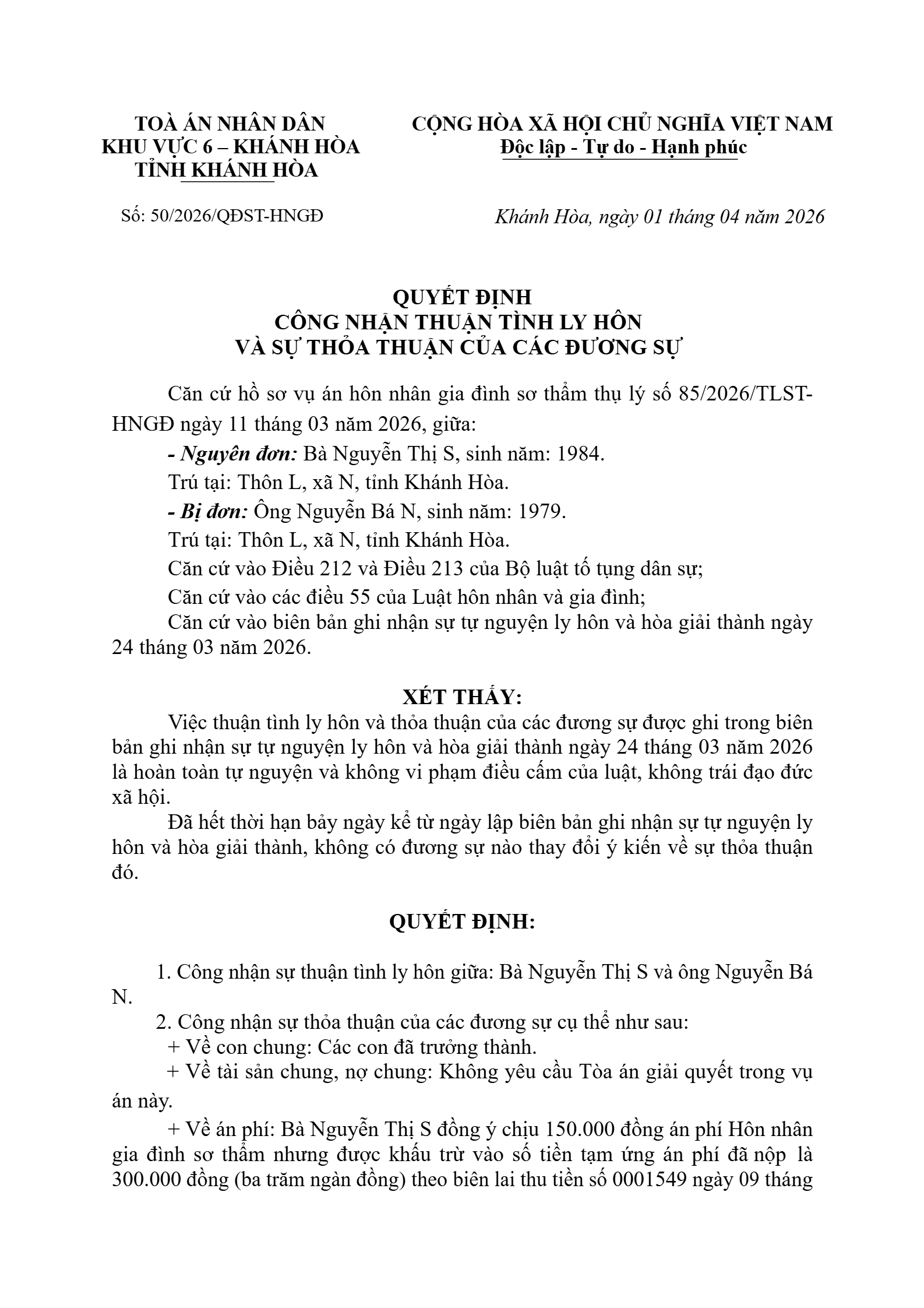 Quyết định số 50/2026/QĐST-HNGĐ ngày 01/04/2026 của Tòa án nhân dân khu vực 6 - Khánh Hòa, tỉnh Khánh Hòa về vụ án ly hôn về mâu thuẫn gia đình