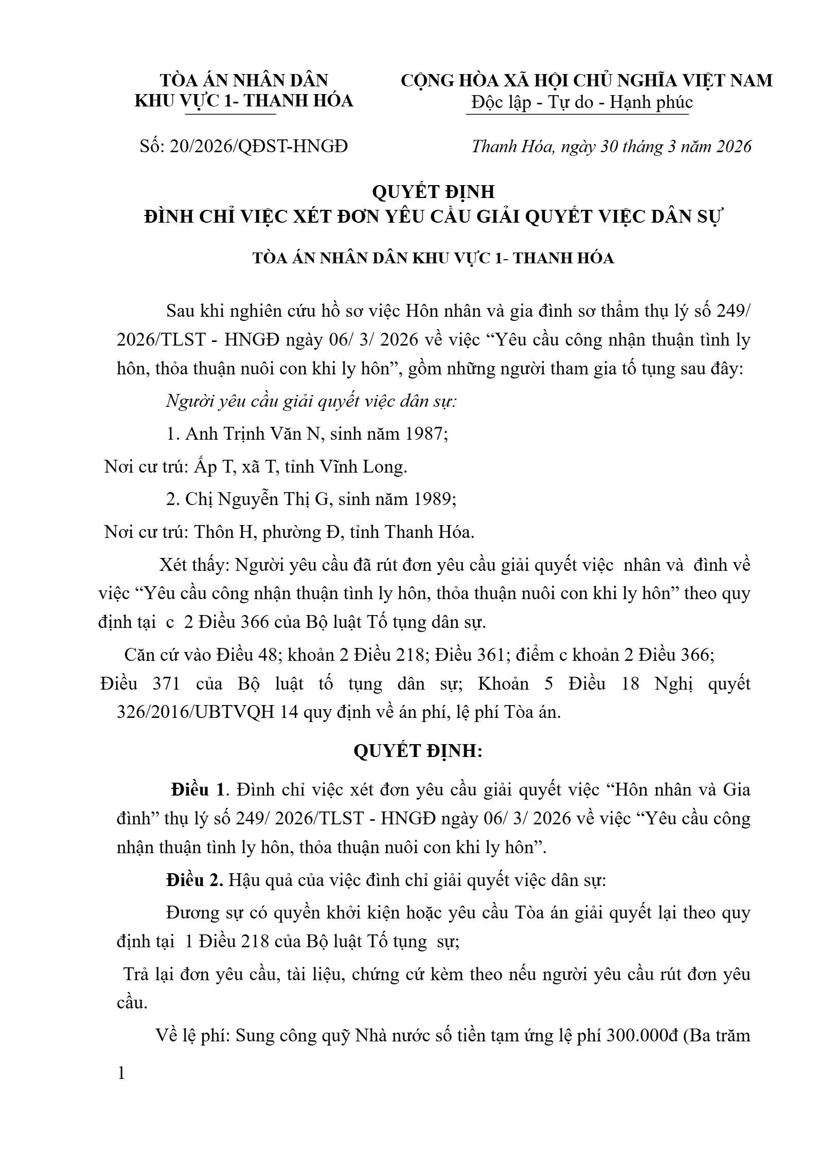 Quyết định số 50/2026/QĐST-HNGĐ ngày 30/03/2026 của Tòa án nhân dân khu vực 1 - Thanh Hóa, tỉnh Thanh Hóa về yêu cầu công nhận thuận tình ly hôn