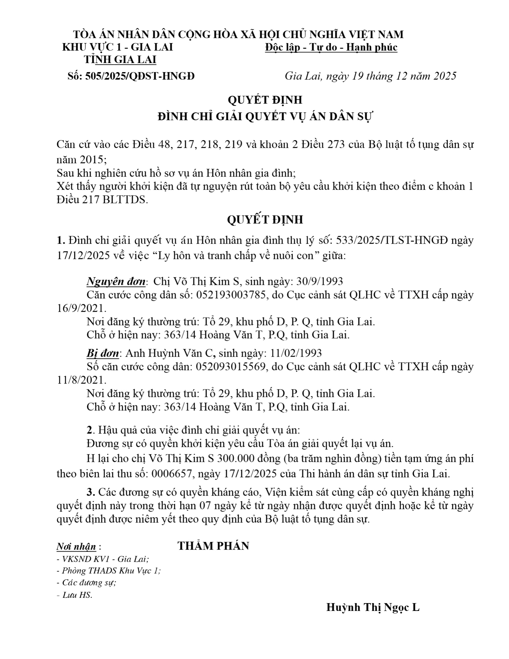 Quyết định số 505/2025/HNGĐ-ST ngày 19/12/2025 của Tòa án nhân dân khu vực 1 - Gia Lai, tỉnh Gia Lai về vụ án ly hôn về mâu thuẫn gia đình